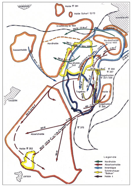 Angaben zum Standort Der Anschnitt des Tagebaus lag ca. 1,0 km südlich der Stadt Ronneburg. Im Verlaufe der Abbauentwicklung dehnte sich der Tagebau im Norden bis an die Stadtgrenze von Ronneburg aus, liquidierte im Osten einen Teil des Bergwerkes Schmirchau einschließlich des Schachtes 356 und bedeckte die Anlagen des Schachtes 352 Lichtenberg (alt) im Südwesten. Sein Abraum wurde in den ersten Jahren der Tagebauentwicklung auf einer ca. 600 m nördlich des Tagebaus liegenden Außenhalde (Nordhalde „alt“) verstürzt. Dieser Haldenkomplex, der sich in den Jahren 1960 bis 1963 in nördlicher Richtung bis an die ehemalige Eisenbahnlinie Ronneburg – Gera ausdehnte, mußte bei der späteren Tagebauerweiterung auf die Etagen des heute als Nordhalde bekannten Komplexes an der Nordwestflanke des Tagebaus umgelagert werden. Nur die seit 1960 mit Abraummassen aus dem südöstlichen Teil des damaligen Tagebaus nördlich des Schachtes 369 angelegte Halde 4 blieb liegen. Ab 1965 erfolgte die Ablagerung des Abraumes auf der sog. Absetzerhalde, die mit einer Förderbandanlage und einem Absetzer betrieben wurde. Mit ihr wurden die genannten Flächen des Schachtes 352 überdeckt, so daß zum Zeitpunkt der Beendigung der Tagebauarbeiten, alle Seiten des Tagebaues von Halden umgeben waren, bis auf den an Ronneburg grenzenden Nord- und Nordostrand.