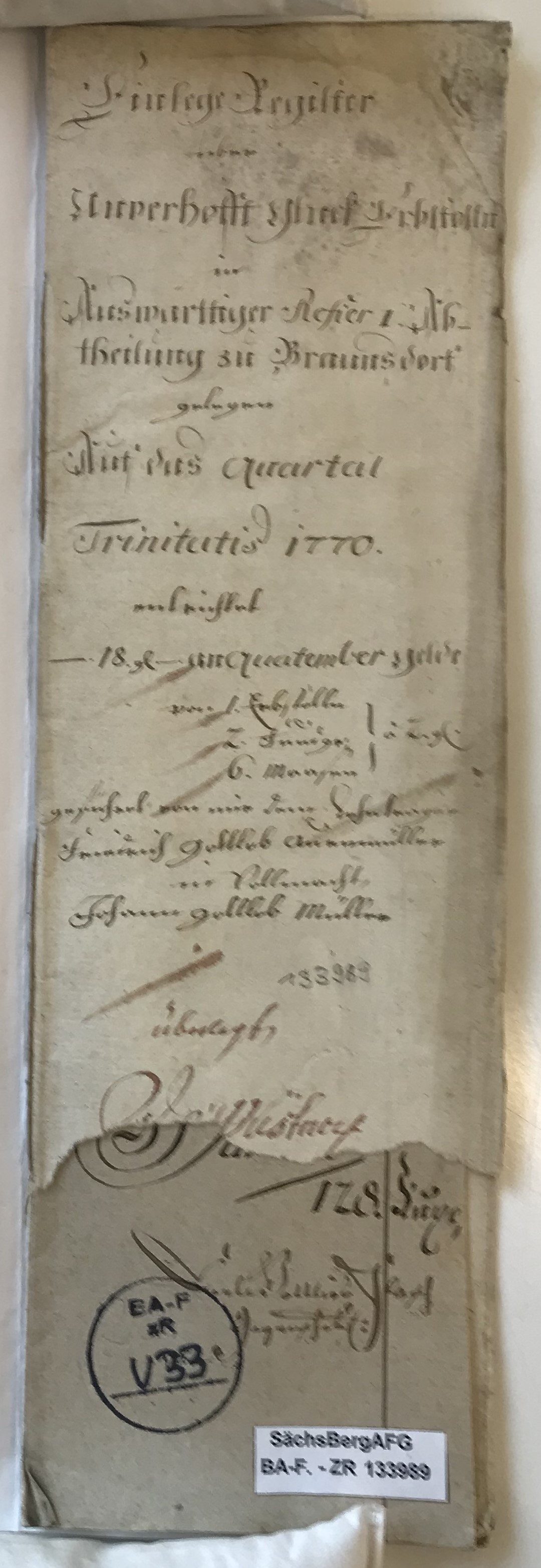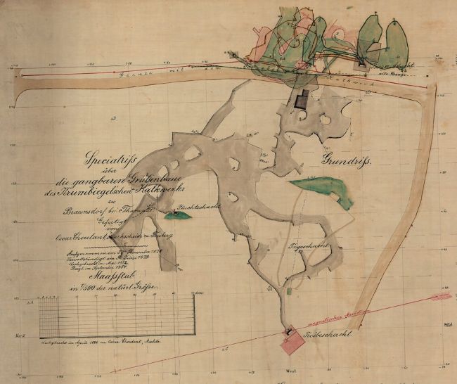 Für den Bereich um Grumbach und Braunsdorf müssen wir das geologische Kartenblatt wechseln. Das östlich anschließende Kartenblatt No. 65, Wilsdruff, wurde in erster Auflage 1894 von K. Dalmer und R. Beck geologisch bearbeitet. Bei ihnen können wir folgende Bewertung dieses Kalksteinvorkommens nachlesen:IV. Das Cambrium „… Dem Cambrium dürfte höchst wahrscheinlich auch das nördlich des Keiles von erzgebirgischen Gneissen gelegene Braunsdorfer Kalklager angehören. Dasselbe wird durch zwei Kalkwerke, das Krumbiegel'sche und Wätzig'sche, unterirdisch abgebaut. Sein Gestein ist ein grauer bis röthlich oder gelblich grauer, meist feinkrystalliner, nur in kleineren Partien gröberes krystallines Korn aufweisender, dolomitischer Kalk, der bald ziemlich rein, bald mehr oder weniger kieselig oder mit Thonschiefersubstanz gemengt erscheint.Die tektonischen Verhältnisse des Kalklagers sind höchst unregelmässige. Streichen und Fallen seiner Schichten wechseln rasch; zahlreiche Verwerfungsklüfte durchsetzen und dislociren die letzteren, so dass die abbauwürdigen Theile des Lagers höchst unregelmässige Form und gesetzlose Verbreitung erhalten, wodurch naturgemäss deren Abbau sehr erschwert wird. Auch die Grenzen des Kalksteinlagers werden von Verwerfungen gebildet, auf welchen dasselbe an cambrischen Thonschiefern abstösst. “
