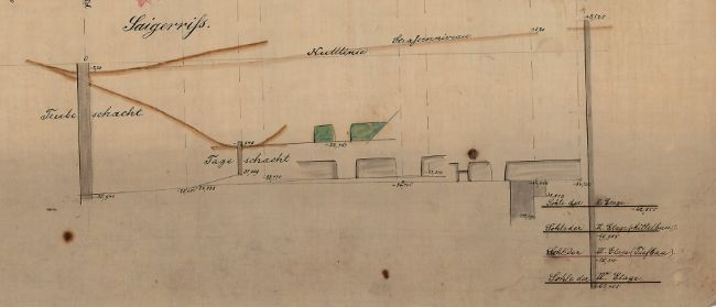 a. Kalksteinbruch Im Schnitt ist unter der „Dammerde“ zuerst „Thonschiefer“, dann eine schmale Lage „gemeiner Alaunschiefer“ (schwarz markiert) und unten der Kalkstein bezeichnet. Der Vermerk g. weist darauf hin, daß schon vor 1805 ‒ vermutlich zur Zeit der Errichtung des Brennofens ‒ Kalkstein auch untertage abgebaut worden ist. |