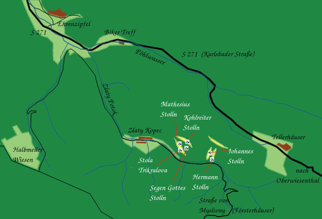 Die Lagerstätte befindet sich an der Flanke eines Bergkamms namens Kaff (heute Daremný). Ab dem 16. Jahrhundert wußte man von ihr, und seitdem wurde hier auch Abbau betrieben. Seine Blütezeit erlebte der hiesige Bergbau im 18. und teilweise im 19. Jahrhundert. Neue Untersuchungen wurden in den 90er Jahren des 19. Jahrhunderts und in den 20er Jahren des 20. Jahrhunderts in Angriff genommen. Nach dem Zweiten Weltkrieg führte das Nationale Geologische Forschungsunternehmen in den Jahren 1959 bis 1962 und 1963 bis 1967 Probebohrungen durch. Abgebaut wurden Kupfer‐ und Zinnerze. Über das genaue Ausmaß des Abbaus im 16. und 17. Jahrhundert in der Umgebung von Kaff liegen uns keine näheren Angaben vor. Die Eisenerze, die in der Skarn‐Lagerstätte in großen Mengen vorkommen, wurden nicht abgebaut, da die Beimischungen von Zink und Kupfer deren Eigenschaften erheblich verschlechterten und die Feuerbearbeitung des hergestellten Eisens erschwerten. Im 16. Jahrhundert war die gesamte Ausdehnung der Lagerstätte bereits bekannt. Gefördert wurden Erze aus vererzten Gangstörungen – z.B. im Stollen Johannes Silbergang. Der Abbau kam im Laufe des Dreißigjährigen Krieges vollständig zum Erliegen. Erst 1716 entdeckte der Grubenbesitzer Horn Anbrüche reicher Kupfererze und Gänge mit einem Gehalt von rund 260 g/t Silber. Die Erze wurden im Jáchymover Hüttenwerk mit Erfolg ausgeschmolzen. Gegenstand des Interesses waren zu jener Zeit vor allem die Kuper‐ und Silbererze, obwohl auch die Produktion von Zinnerzen belegt ist. In der Grube Johannes wurden jährlich rund 500 kg Kupfer geschmolzen, nach und nach aber verlagerte sich das Interesse hin zur Förderung von Zinnerzen. Mitte des 18. Jahrhunderts wurden jährlich rund 400 kg Kupfer und 1.700 kg Zinn produziert. Im Jahre 1811 war die Grube Johannes die größte Gruppe des Reviers und hatte nun den Höhepunkt ihrer Entwicklung erreicht, denn dank des Durchstichs des Johannes‐Stollens war es gelungen, der Probleme im Zusammenhang mit dem Grubenwasser wenigstens teilweise Herr zu werden. Der Johannes‐Stollen wurde vorgetrieben, um weitere Grubenbaue zu entwässern. In jener Zeit arbeiteten rund 20 Knappen in der Grube. Der Abbau aber war an seine Grenzen gestoßen, und dies in Form eines hohen Zuflusses des Grubenwassers unter dem Stollenniveau. Hinzu kam, daß auch die technologische Bearbeitung des Erzes Probleme bereitete. In den 40er Jahren des 19. Jahrhunderts kommt der Abbau praktisch zum Stillstand, für den weiteren Betrieb der Gruben werden nur noch minimale Kosten aufgewendet. |