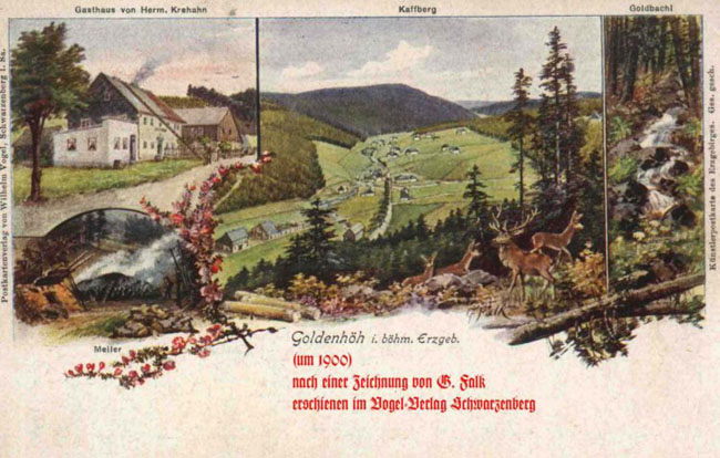 Das Gebiet um Goldenhöhe war schon seit dem 16. Jahrhundert ein nicht unbekanntes Bergbaugebiet für die Gewinnung von Silber, Kupfer und auch Eisenerz. Dabei erscheint der Name „Kaff“ schon in der ersten böhmischen Bergwerksordnung König Ferdinands I. auf das Jahr 1548. Der Name Goldenhöhe und Goldbach für das Wasser im Tal sind wohl auch auf einige Goldfunde dieser Zeit zurückführbar. Im 19. Jahrhundert erweckten besonders die Eisen- und Zinkerzmineralien das Interesse der Montanwirtschaft. Auch erste Funde von Uran sollen in diese Zeit fallen. Dieser Umstand machte vor und nach dem 2. Weltkrieg das Bergrevier zum Ziel einer neuen, aber nur kurzen Bergbauperiode. Verwaltungstechnisch gehörte Goldenhöhe vor dem 2. Weltkrieg zum Dorf Seifen (Rýzovna) und war größtenteils deutsch besiedelt. Hier lebten etwa 350 Menschen in 41 Häusern. Mitte der 30er Jahre gab es 4 Gastwirtschaften, darunter auch eine Pension mit 6 Betten mit dem Namen „Stieler“, sowie 2 Gemischtwarenläden, 3 Holzgeschäfte und das Bergwerk „Gustav“. Desweiteren gehörte auch der Ort Böhmische Mühle (Český Mlýn) direkt an der sächsischen Grenze zu Seifen. Bis Ende des 2. Weltkriegs befand sich im Ort das Gasthaus „Zur Patscherei“. Die im Ergebnis des 2.Welkrieges erlassenen Beneš- Dekrete führten zur Vertreibung der deutschen Einwohner und dem Abriß der Dörfer bis Anfang der 1960er Jahre. Heute entstehen wieder Wochenendhäuser auf den ehemaligen Siedlungsplätzen und leiten eine neue Epoche im Zusammenleben beider Nationen ein.