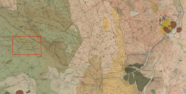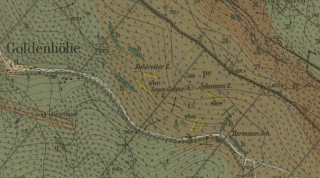 In den „Erläuterungen zur geologischen Spezialkarte des Königreichs Sachsen, Blatt Wiesenthal-Weipert, Nr. 147 “ von 1917 wird die Region folgendermaßen beschrieben: „ c) Strahlsteinlager mit Blende und Magneteisenerz (sbe). Die charakteristischen Erze dieser im Phyllitgebiete auftretenden Lager sind Zinkblende und Magneteisenerz, während Zinnstein nur ganz lokal und unbeständig hinzutritt. Eine montanistische Bedeutung haben besonders die Lagerstätten am Südhange des Kaffenberges bei Goldenhöhe erlangt, wo die zahlreichen Pingen und Schächte, die ausgedehnten Haldenzüge und die verfallenen Pochwerke im Talgrunde Zeugnis von dem einst lebhaft betriebenen Bergbaue ablegen. Auf den vier größeren, petrografisch vollkommen übereinstimmenden Lagern bauten folgende Zechen: Kohlreiter, Segen Gottes, Johannes und die Zeche am Hermannschachte. Magneteisen und Blende (oft als Kohlenblende) bilden bis zu 0,3 m mächtige Putzen und Nester, nicht selten mit Kupfer- und Eisenkies verwachsen, welche letztere sich lokal als selbstständig anreichern. Mit diesen Erzen in Lagen abwechselnd oder als inniges Gemenge mit ihnen findet sich dunkel- bis hellgrüne Hornblende, bisweilen Strahlstein*) in feinfaserig – strahligen Massen, sowie Chlorit, dicht, feinschuppig bis grobblätterig, ferner hell- bis dunkelgrüne serpentinartige Mineralien, z. T. Mit Erhaltung des Gefüges und unter Ausscheidung von Magneteisenerz aus Strahlstein hervorgegangen. Zinnstein soll sich hauptsächlich auf Klüften und sekundären Trum- und Gangbildungen im Bereiche des Erzlagers vorgefunden haben. Mit dem umgebenden Schiefer sind die Erzlager durch Wechsellagerung verbunden, und oft von tief schwarzen kohlenstoffreichen und feldspatführenden Phyllitlagen durchzogen.“ *) Diese inzwischen etwas veraltete Bezeichnung meint das Kettensilikat Aktinolith Ca2(Mg,Fe)5[OH/Si4O11]2.