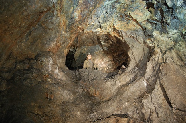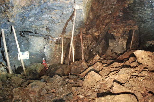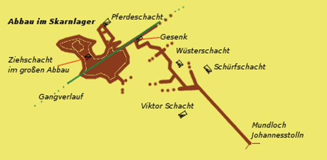 Der Skarnkörper, der mittels eines Kammerabbausystems abgebaut wurde, wird in Ost-West-Richtung von einer Reihe tektonischer Störungen durchzogen, die stellenweise mit Silber-, Kupfer- und Zinnerzen vererzt sind. Diese Erze wurden dann abgebaut. Das Abbausystem dieser Erzgänge unterschied sich jedoch vom Abbauverfahren der massiven oder Imprägnationsvererzung im Skarnkörper. Bis zum 18. Jahrhundert fand Strossenbau Anwendung. Der vererzte Gangabschnitt wurde dabei mithilfe einer stufenartigen Abbaufront und Erzschurren (Rollschächte) abgebaut. Grundlegender Ausrichtungsbau ist der Querschlag (in unserem Fall erfüllt der Johannes‐Stollen die Funktion des Querschlags), der zumeist lotrecht zur Streichrichtung der Gangstruktur ausgerichtet ist. Vom Querschlag aus folgen dem Gang sog. Ausrichtungsstrecken, deren Aufgabe darin besteht, das Vorhandensein einer Vererzung zu überprüfen und dem Erzgang bis zu seinem Auskeilen zu folgen. Ist eine Vererzung vorhanden, werden sie als Ausrichtungs‐ und Transportbaue genutzt. Einen vertikalen oder geneigten Grubenbau, der nicht Übertage ausmündet, sondern zwei Sohlen verbindet, bezeichnen wir als Kamin. Im Falle, daß ein vertikaler oder geneigter Bau unter das Niveau der letzten Sohle geschlagen wurde (in unserm Fall ist der Johannes-Stollen die tiefste Sohle), bezeichnen wir ihn als Gesenk; im Falle, daß von ihm aus eine weitere Sohle unter dem Niveau der Sohle, von der aus er angelegt wird, geschlagen wird, bezeichnen wir ihn als Blindschacht. |