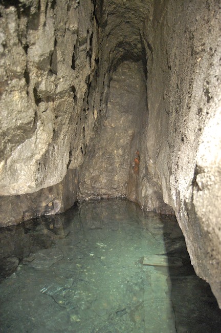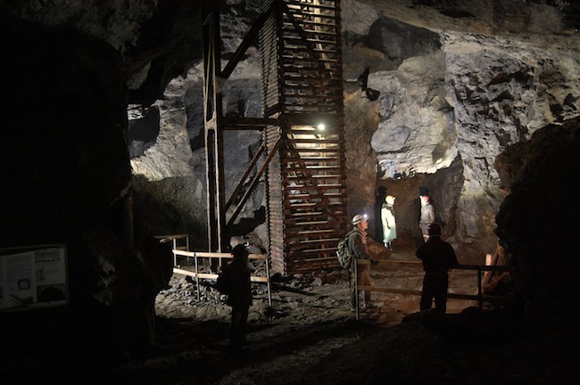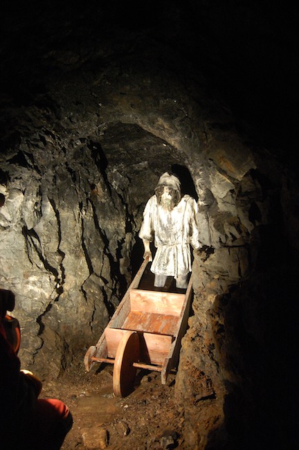 Der Erzabbau in den böhmischen Ländern setzte an der Wende vom 13. zum 14. Jahrhundert ein. Für den Streckenvortrieb benutzte man überwiegend Eisen und Schlägel, dort wo die Bedingungen es erforderten, auch mithilfe des Feuersetzens, wodurch sich das Gestein leichter löste. Diese Verfahren waren unter Verwendung der herkömmlichen Bergbaugerätschaften und Werkzeuge arbeitsaufwendig und der Vortrieb ging nur langsam vonstatten. Mit Eisen und Schlägel wurden in einer 6-Stunden-Schicht auf einer Strecke mit einem Profil von rund 2 m x 1 m etwa 2,5 cm herausgebrochen. Die Strecken wurden daher zumeist nur im minimalen Profil vorgetrieben. Mithilfe von Eisen und Schlägel wurde der Abbau noch bis Mitte des 18. Jahrhunderts betrieben. Die erste Verwendung von Schwarzpulver für Sprengarbeiten ist aus dem Jahre 1627 aus Banská Štiavnica überliefert. Von dort aus breitete sich dieses Verfahren dann auch in andere Länder aus. Strecken, die mithilfe von Eisen und Schlägel vorgetrieben wurden, erkennt man an den charakteristischen Meißelspuren an den Stollenwänden – wir finden sie beispielsweise fast auf der ganzen Länge des Johannes-Stollens und in einigen Abschnitten der Kammern. Die exklusive Stellung von Eisen und Schlägel als dem grundlegenden Arbeitswerkzeug im Bergbau illustriert auch deren Verwendung in der Bergbausymbolik, wo Eisen und Schlägel – über Kreuz angeordnet – seit dem 12. Jahrhundert als Bergmannswappen verwendet werden. |