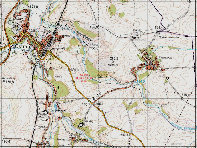 Die Topographische Karte, Ausgabe für die Volkswirtschaft von 1988, zeigt den damaligen Abbaustand durch den VEB Ostrauer Kalkwerke. Wohl, weil die Abraummächtigkeit am Talhang geringer war, baute man zunächst in südöstliche Richtung gegen den Eichberg hin ab. Aber auch die schon bewaldeten Restlöcher der Kalkwerke im Tännicht und bei Münchhof sind zu erkennen. Nördlich von Zschochau hat sich noch immer der „Spitzer Kalkofen“ als Flurname erhalten.