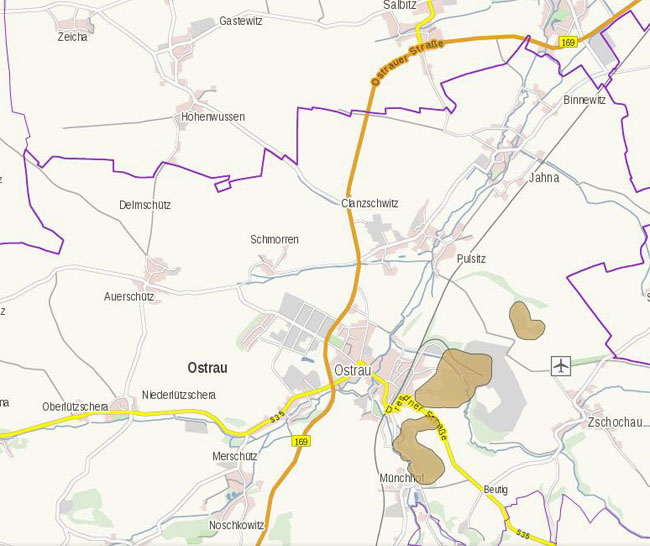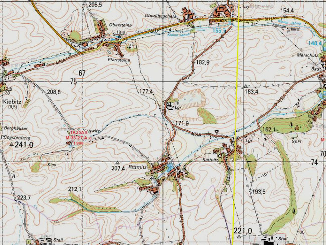 In Rittmitz (links unten) und Trebanitz wurde ausschließlich übertägig abgebaut und auch bei Clanzschwitz finden sich keine Eintragungen. Zwischen Kalkgrund und Münchhof, südlich der Dresdner Straße, wurde zumindest nach 1869 und nach unserer Kenntnis ebenfalls nie untertägig abgebaut. Sicher weiß die Bergbehörde darüber noch mehr als wir und vermutet trotzdem, daß auch hier untertäger Bergbau umgegangen sein könnte.
