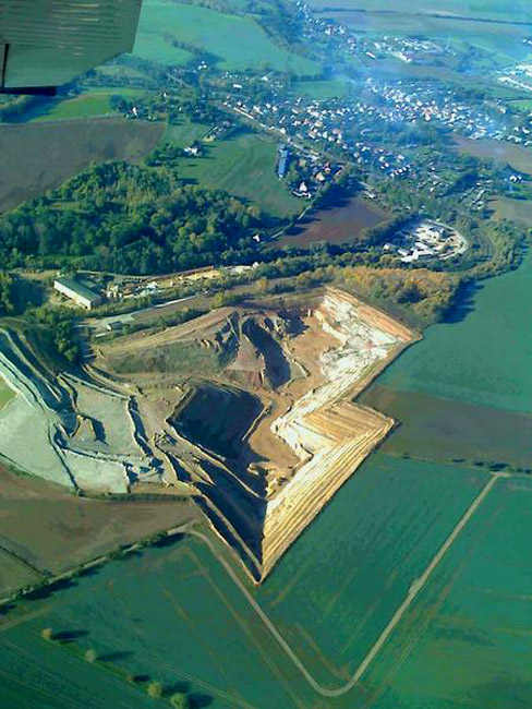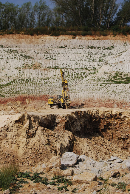 ![]() In diesem Profil erkennt man über dem Plattendolomit (auf dem gerade das Bohrgerät die nächsten Sprenglöcher bohrt) gut das dünne, rot gefärbte Band der oberen Letten, darüber helle Kiessande und obenauf schließlich den gelbbraunen Löß. |