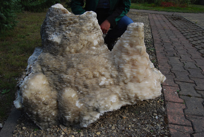 ![]() Dieses Fundstück aus der Betriebsgeschichte belegt die Lösungsvorgänge durch zirkulierende Wässer im Gestein. Es wurde geborgen und im Werksgelände aufgestellt. |