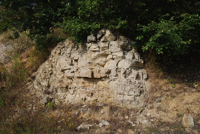 ![]() Nach Norden nimmt die Mächtigkeit des Dolomits wieder zu. Im Liegenden ist er relativ dünnplattig und geht dort allmählich in die unteren Letten über. |