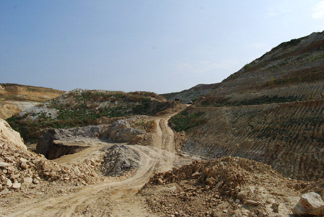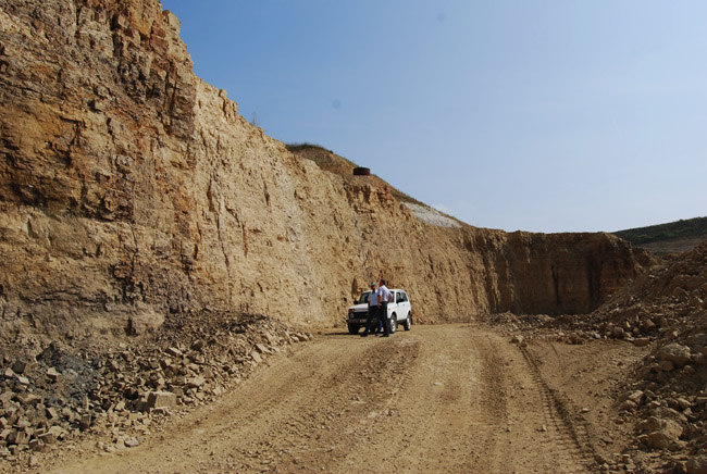 ![]() Vor uns nun der aktive Abbaubereich. Geradeaus erkennt man anhand des Versprungs der Dolomitoberfläche am Bruchstoß eine Auslaugungsrinne. |