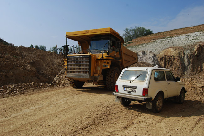 ![]() Diese Kipper haben 35 Tonnen Ladekapazität und wiegen voll beladen über 70 Tonnen. Und das sind noch gar nicht die größten ihrer Art. |