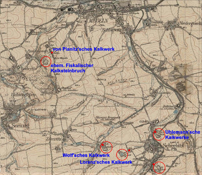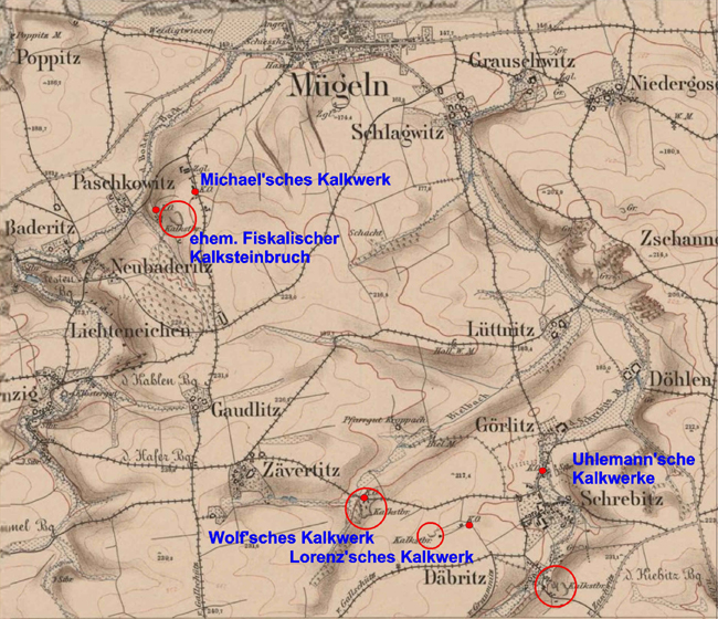 In der genannten Auflistung werden jedenfalls die folgenden sieben, im Jahre 1900 aktiven Kalkwerke zwischen Mügeln und Ostrau aufgeführt; davon liegen nur zwei bei Ostrau, die übrigen fünf verteilen sich über den südwestlichen Ausbiß des Plattendolomits und konzentrieren sich insbesondere um den Ort Schrebitz:
