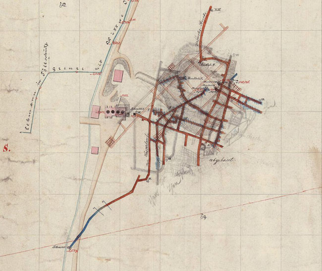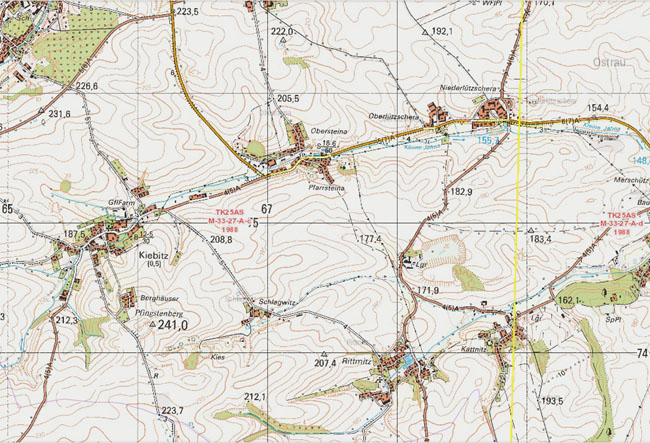 ![]() Ausschnitt aus der Äquidistantenkarte, Blatt No. 30 mit dem Gebiet südlich von Mügeln. Hervorhebungen wie oben.