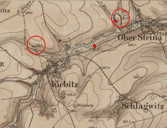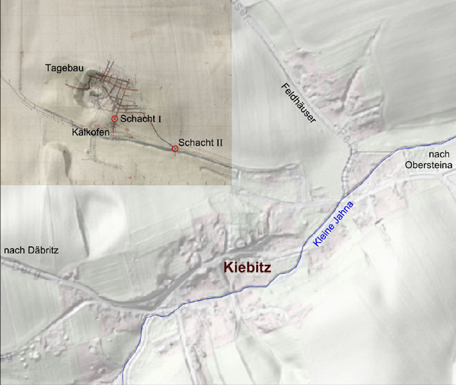 ![]() In diesem Ausschnitt aus der Topographischen Karte aus den 1930er Jahren haben wir die drei ehemaligen Kalkwerksstandorte rund um Kiebitz noch einmal eingekringelt. Außer dem Runge´schen Restloch ist jedoch schon damals nichts mehr erhalten geblieben. Nur der Kalkofen bei Obersteina ist zu dieser Zeit noch vermerkt.
