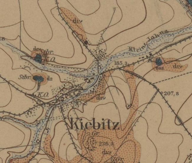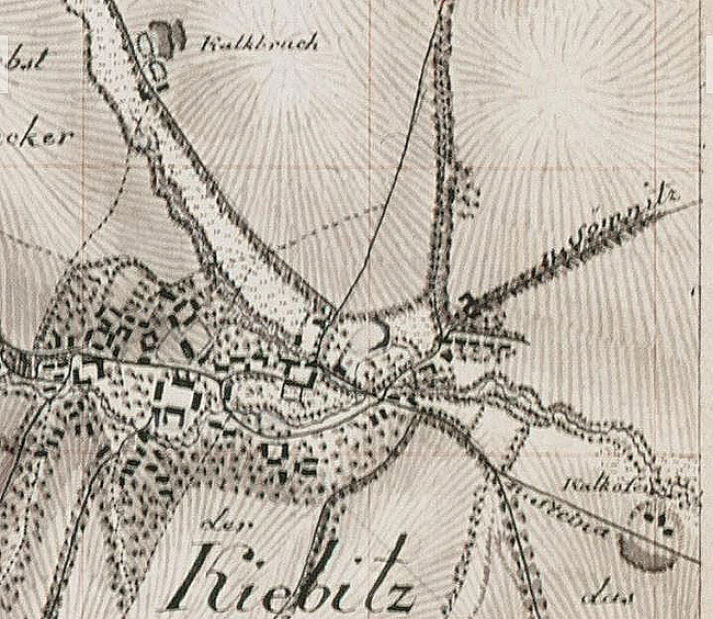 Der Ortsname Kiebitz hat mit dem hübschen Vogel nichts zu tun. Der Name wird vielmehr von den Familien, die im 12. und 13. Jhdt. hier lebten, abgeleitet. Der Ort wird als Kywitz erstmals in einer Kaufurkunde des Kloster Altzella vom 7. März 1216 genannt. Ein Johann von Kywitz wird darin als Zeuge aufgeführt, offenbar damals Besitzer des Rittergutes. Nach Pönicke, 1860, treten bereits 1185 ein Saxo und ein Jarus von Kyvic am markgräflichen Hofe in Erscheinung. Ein Conradus de Chewicz wird auch in einer undatierten Urkunde genannt, die aufgrund der Lebensdaten der beteiligten Zeugen auf die Zeit vor 1190 datiert werden kann und von den Historikern dem Ort Kiebitz zugeordnet wurde. Der meißnerische Bischof Witigo kaufte am 8. November 1276 Kiebitz dem Kloster Bosau für 195 Mark Silber ab. Nach Pönicke wurden die Erbgerichte zu Kiebitz 1286 von Heinrich dem Erlauchten dann dem Kloster Buch geschenkt. Am 16. Februar 1350 bestätigte König Karl, IV. dem Domkapitel Meißen seine Privilegien und Besitzungen, worunter auch Kiebitz (als Kywic) erneut aufgeführt wird (10001, Nr. 03222). Im Jahr 1355 verkaufte Markgraf Friedrich, III. den Ort zusammen mit Schmörren und Schlagwitz an Bischof Johann, I. zu Meißen (10001, Nr. 03394a). Vor 1460 wurde das Gut zum Rittergut erhoben und befand sich zu dieser Zeit als bischöfliches Lehen im Besitz von Balthasar von Döhlen; später gelangte es an Heinrich von Saalhausen. Im Besitz dieser Familie ist es lange geblieben. Aus Akten des Lehnhofes erfahren wir, daß das Gut Kiebitz danach im 16. Jahrhundert an Georg von Grünroda, ab 1647 dann an Hans Georg von Auerswalde verliehen war (10080, Nr. O 03407). Im Postlexikon von A. Schumann wird der Ort folgendermaßen beschrieben: „Kiebitz; Dorf in dem Königr. Sachsen, im Leipziger Kreise, im Kollegiatstift Würzen, im Amte Mügeln, 2 Stunden nördl. von Döbeln entfernt, auf der Gränze des Erbamtes Meissen gelegen. Es hat eine Pfarrkirche und Schule, die unter der Inspection Wurzen stehen und deren Collator das Stiftsmeißn. Consistorium zu Wurzen ist; ein Rittergut, Landschöppengut, 28 5/8 Hufen und 374 Einwohner. Von den Einwohnern stehen 168 mit 27 5/8 Hufen unmittelbar unter dem Amte Mügeln, 102 unter den hiesigen Pfarrgerichten und 102 unter dem hiesigen amtssässigen Rittergute. Das hiesige Landschöppengut mit einer Hufe hingegen steht unter dem Erbamte Meissen. Eingepfarrt in die hiesige Kirche sind: …(?), Oberlützschen, Niederlützschen, Ober-Zschörpitz (?), Jesenitz, Auerschütz, Zschoschwitz, Bennewitz, …(?) Obersteina und Pfarrsteina.“ (Band 4, 1817) Ab 1826 (nach Pönicke, 1860) befand sich das Rittergut Kiebitz im Besitz von Johann Platz (20005, Nr. 0754). In der Mitte des 19. Jahrhunderts hatte es offenbar sein Nachfahre Heinrich Ferdinand Platz inne, welcher zwischen 1854 und 1857 Parzellen mit mehreren dortigen Grundstücksbesitzern tauschte; vielleicht auch schon, um Abbauflächen für einen Steinbruch zu gewinnen. In der im ersten Teil unseres Beitrages schon erwähnten Zeitungsmeldung aus dem Jahre 1815 (Schmidt, 2005) treten als Kalkbruchbesitzer in Kiebitz die Herren Johann Christian Oehmichen und Andreas Gruhle auf (es hat also schon damals mindestens zwei Brüche zeitgleich in Kiebitz gegeben).
