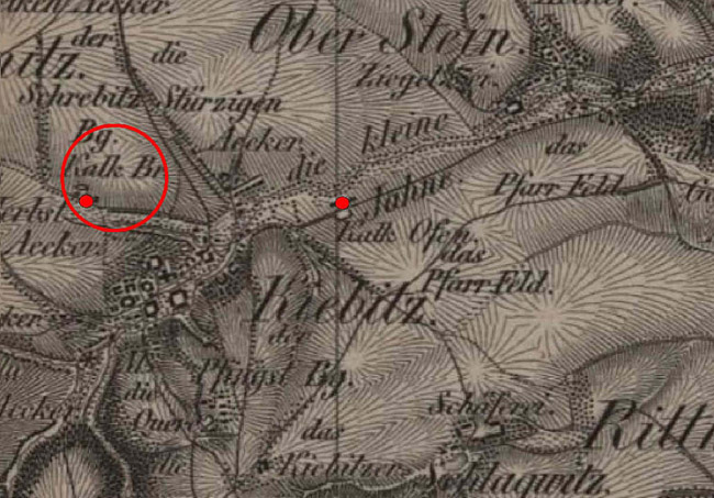 ![]() Auf der Oberreit’schen Karte aus den 1850er Jahren ist ein Steinbruch und Brennofen bei Niederlützschera verzeichnet.