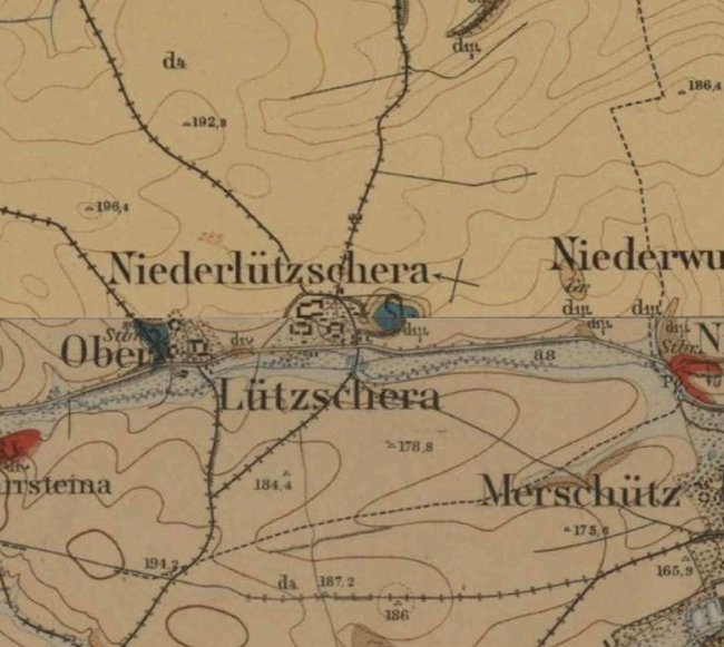 Noch dünner ist die online recherchierbare Aktenlage im Staatsarchiv bezüglich des Ortes Lützschera. Immerhin jedoch wird es als Lueczerow in einer Belehnungsurkunde anno 1365 erstmals urkundlich erwähnt (10001, Nr. 03799). Die vormaligen Amtsdörfer Niederlützschera und Ostrau wurden 1836 und 1846 vom Amt Nossen an das Amt Mügeln abgegeben (20012, Nr. 4230). Bereits 1734 wird ein Hans Georg Platz in Oberlützschera erwähnt (10036, Loc.35339). Anfangs des 19. Jahrhundert befand sich auch das benachbarte Rittergut Kiebitz im Besitz von Johann Platz (20005, Nr. 0754). In der Mitte des 19. Jahrhunderts hatte es dann noch immer ein Nachfahre namens Heinrich Ferdinand Platz inne. Aus dem Jahr 1758 ist ein Konzessionsgesuch eines Herrn Andreas Mierisch aus Oberlützschera und des Herrn Christian Junghans aus Dobritz zur Errichtung eines Kalkofens erhalten geblieben. Allerdings ist noch unklar, ob dieser Kalkofen tatsächlich in Lützschera errichtet werden sollte, denn es folgten Beschwerden der Gemeinden Graumnitz (südöstlich von Schrebitz) und Göldnitz über die erteilten Konzessionen (10036, Loc. 01839/05). Aus der Zeitungsnachricht von 1815 ist uns als Eigner eines Kalkwerks in Niederlützschera zu dieser Zeit auch noch der Herr Johann Gotthelf Seifert bekannt.
