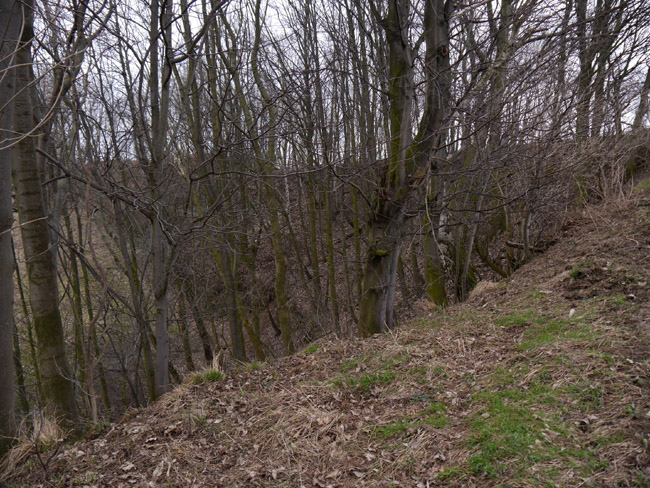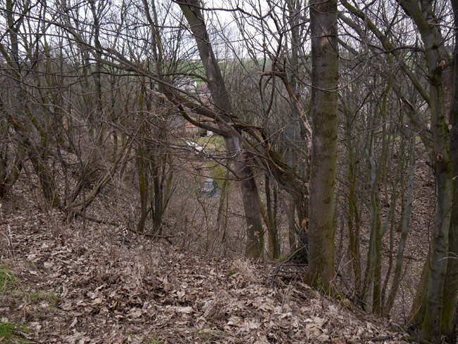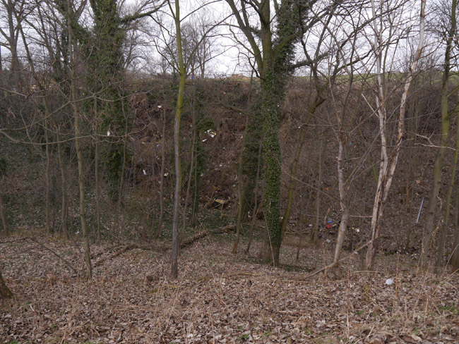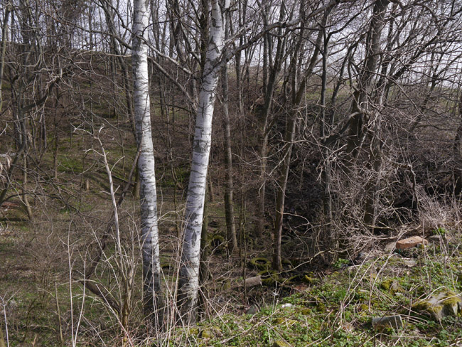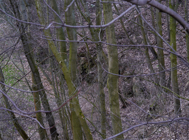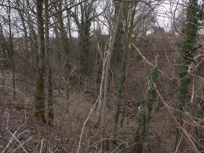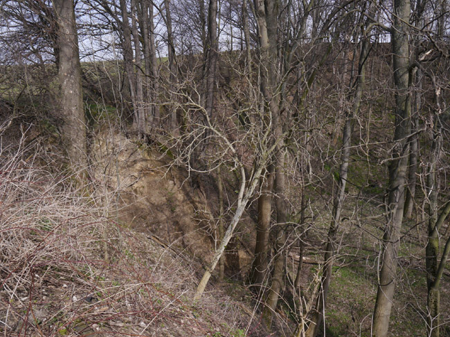 Die ebene Fläche weiter talwärts und hier links im Bild ist die Abraumhalde dieses Kalkwerkes. Am Talhang gegenüber markiert der alte Baumbestand dann das Restloch des Runge'schen Steinbruchs. |