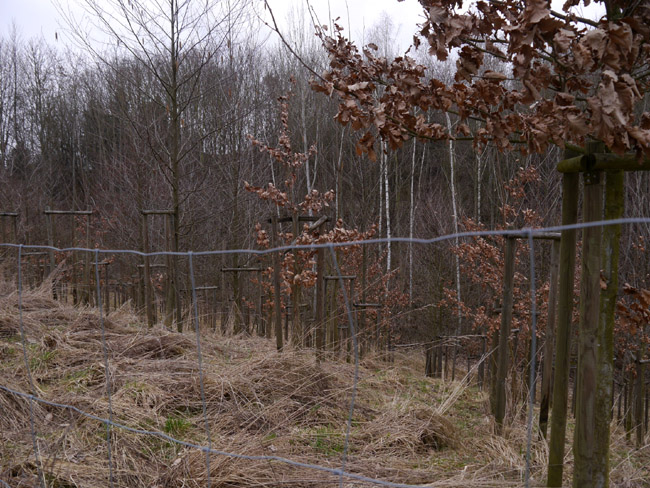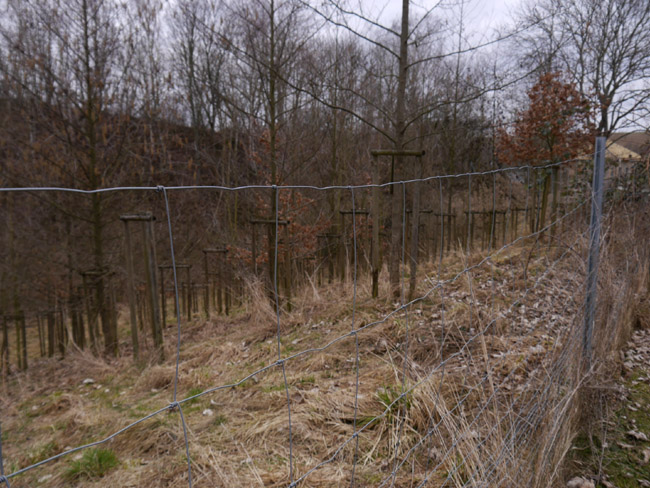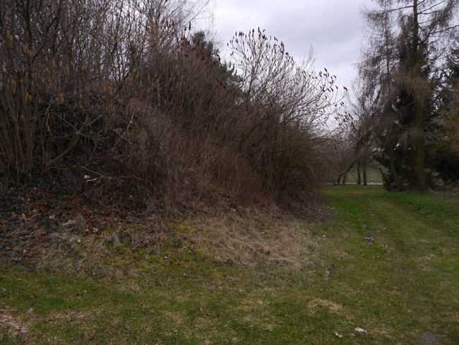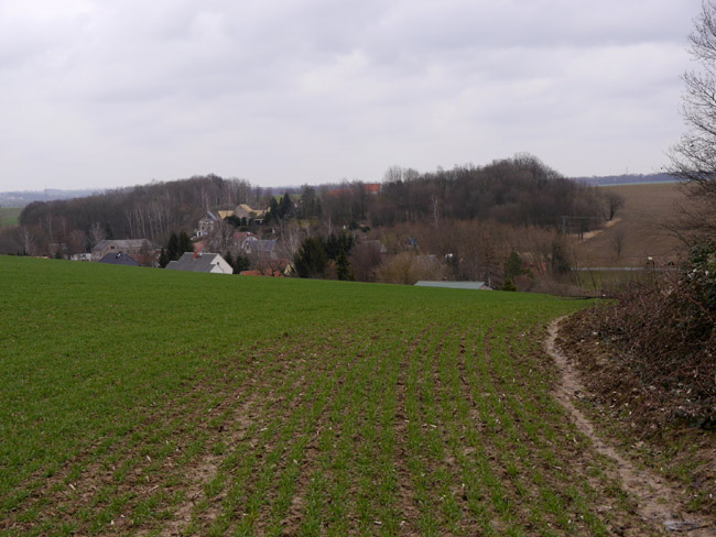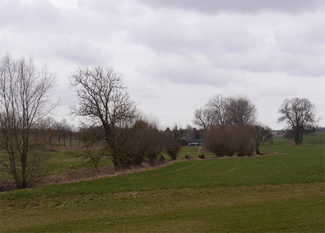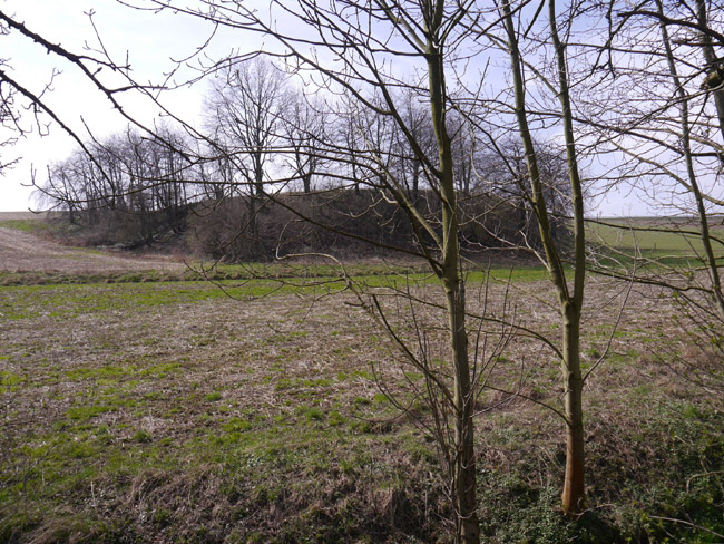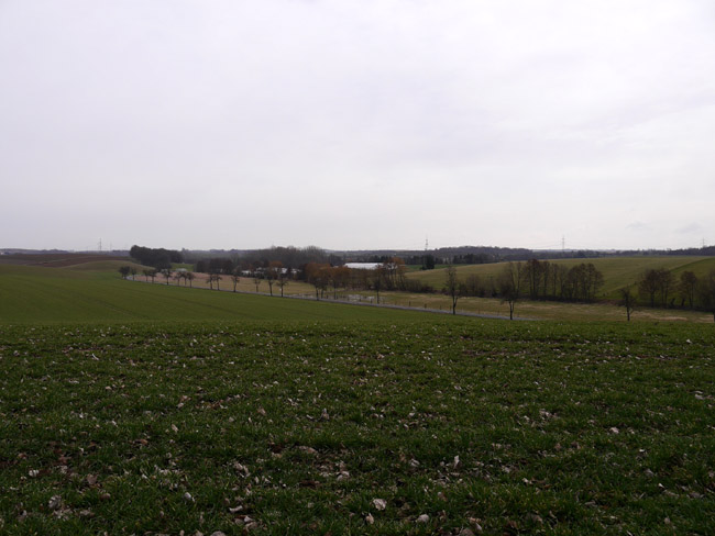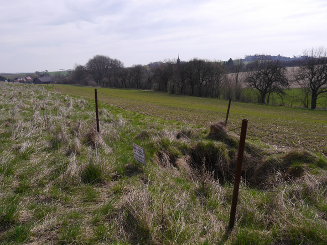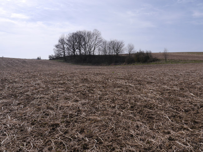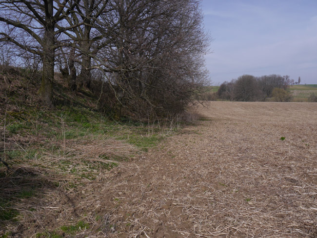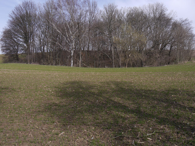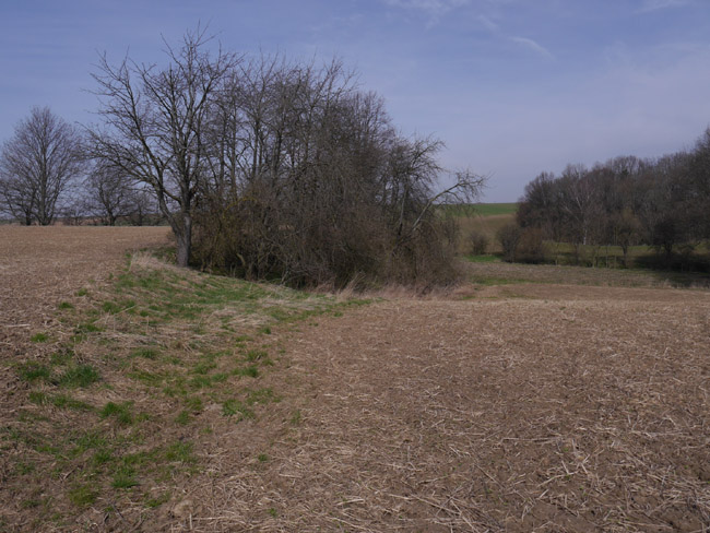 Um diese Jahreszeit bekommt man noch keinen Ärger mit den Bauern und kann mal über´s Feld laufen. Hier ist vom zweiten Kalksteinbruch noch die Abraumkante zu finden - durch eine Baumreihe markiert. Das Restloch ist längst aufgefüllt. |