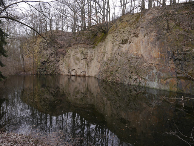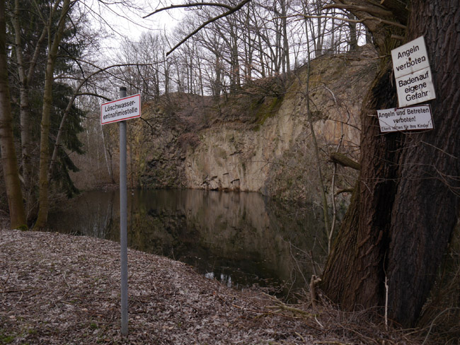 Nach dem Überqueren des kleinen Bächleins hat man das Restloch des Runge'schen Steinbruchs vor sich. Bauliche Reste vom Kalkwerk sind aber nicht mehr vorhanden. |