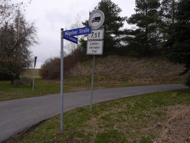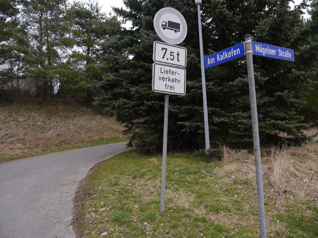 Von dieser Straßenecke aus führt ein Feldweg um die Halde des Kalkwerkes herum. |