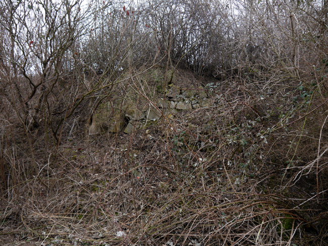 Um diese Jahreszeit findet man unter dem noch lichten Gestrüpp auf den Haldenböschungen noch ein paar Mauerreste, die nach ihrer Lage und Ausführung zum Kalkbrennofen gehört haben könnten. |
