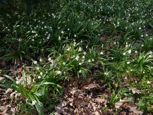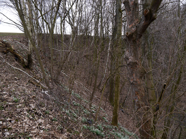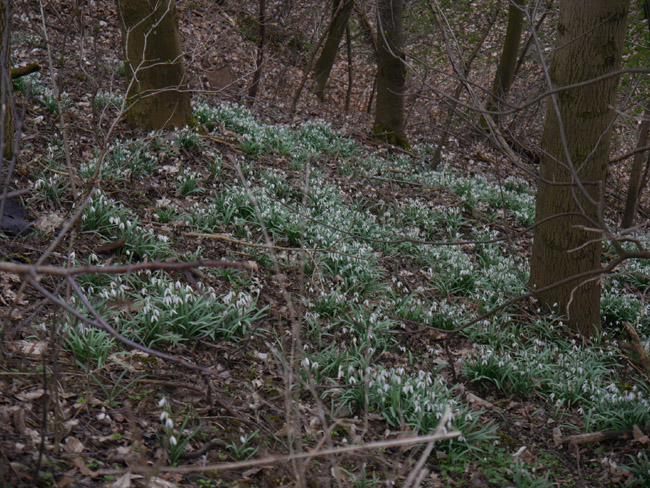 Beim ersten Blick die Böschung hinab sind wir von den Schneeglöckchen-Wiesen überrascht, die sich hier ausbreiten. |