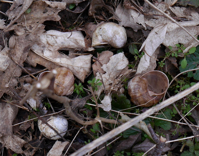Reichlich zu finden sind auch hier Gehäuse der Weinbergschnecke Helix pomatia, die bekanntlich kalkreiche Böden bevorzugt. |