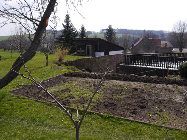 Beim Weg am Feldrain drumherum stellt sich heraus, daß die heutige Garage auf den Grundmauern des alten Kalkofens steht. |