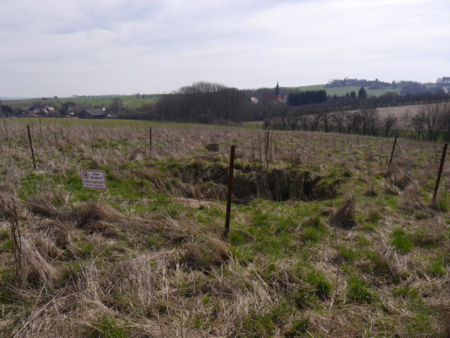 Im Frühjahr 2017 haben wir alles in allem vier solcher mehr oder weniger großen Pingen vorgefunden. Wie am Tännigt in Pulsitz brechen auch hier die alten Pfeilerbruchbaue offenbar langsam nach oben durch und die Bauern pflügen lieber respektvoll drumherum. Im Hintergrund die Kiebitzer Kirche. |