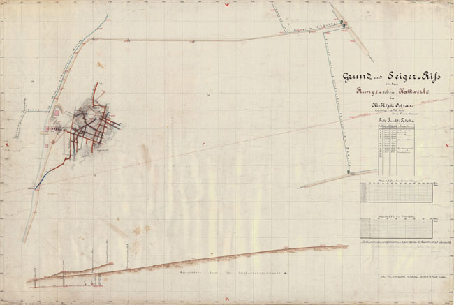 ![]() Grund- und Saigerriß der Runge'schen Kalkwerke in Kiebitz bei Ostrau, gefertigt 1882/83 von L. Hünich. Bildquelle: Sächsisches Staatsarchiv, Bergarchiv Freiberg, Bestand 40037-1 (Deponierte Risse der Steine- und Erdenindustrie), Nr. K22801. Gesamtansicht, Norden ist rechts.