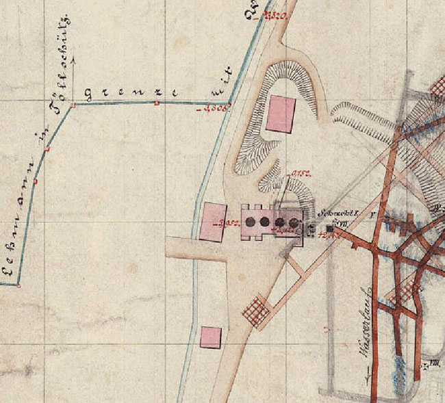 Ein weiterer Ausschnitt zeigt, daß das Runge’sche Kalkwerk über ein Ofengebäude mit vier aneinandergereihten Niederschachtöfen verfügte.