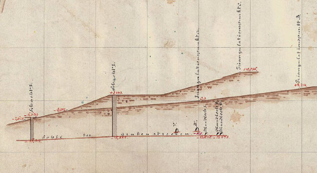 ![]() Ausschnitt aus obigem Riß mit dem zugehörigen Saigerschnitt. Dargestellt sind die beiden erwähnten Schächte mit zirka 18,0 m (Schacht I) und zirka 8,7 m Teufe (Schacht II), von dem aus die Rösche zur Wasserlösung weiter nach Südosten verlaufen sein muß. Der Tagebau lag nördlich des Schachts I im Bereich der eingezeichneten Stollenmundlöcher und ist hierin ebenfalls nicht dargestellt.