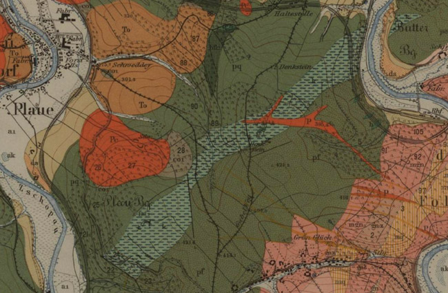 ![]() Ausschnitt aus der geologischen Karte mit dem hier beschriebenen Gebiet. Bezeichnet mit „St.“ sind darin die zwei Stolln zu finden.