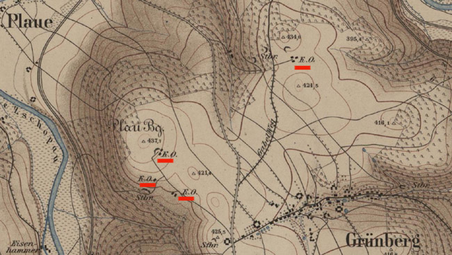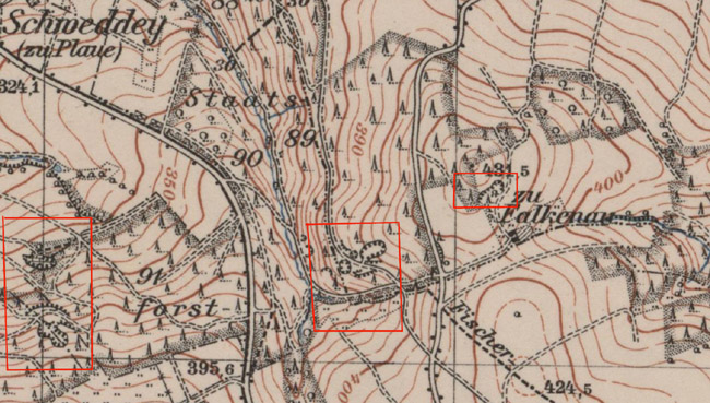 Bei dem im Schreiben von 1804 erwähnten Brennofenneubau dürfte es sich um den Kalkofen neben den Schwedenlöchern handeln. Es ist der einzige noch erkennbare Rest eines Kalkbrennofens in diesem Gebiet. Bei Kunnersdorf gibt es noch den etwas besser erhaltenen Rest eines 1833 erbauten Kalkofens. Johann Georg Schippan starb 1848 im Alter von 88 Jahren, sein Sohn Moritz starb 1842 im Alter von 41 ½ Jahren. Wie schon im Entwurf 2007 werden in der 2010 erschienenen Bergbaumonografie „Marmor im Erzgebirge“ ohne Angaben über Betriebszeit und Lage der Abbaue C. F. Schreyer, M. Schippan, Ranft und von Carlowitz als Besitzer oder Betreiber genannt. Zu bedenken ist, dass es in diesem Gebiet einen weiteren untertägigen Abbau, mehrere Tagebaue und Abbauversuche gab, die in keiner Veröffentlichung erwähnt werden. In der Geologischen Specialkarte des Königreichs Sachsen, Section Schellenberg - Flöha von 1879 gibt es im Gebiet des Kalkschiefers bei Plaue keine Bezeichnung Kalkhöhlen oder Schwedenlöcher und keine Hinweise auf untertägige Abbaue. Es sind nur zwei Steinbrüche bzw. Tagebaue und zwei mit K.O. bezeichnete Gebäudestandorte am Plauberg, ein mit K.O. bezeichneter Gebäudestandort etwas südöstlich dieser Kalkschieferzone, zwei Steinbrüche im Kalkschiefer etwas westlich vom Gabelweg und ein Steinbruch oder Tagebau sowie eine mit K.O. (Kalkofen?) bezeichnete Gebäudegruppe ca. 100 m östlich vom Gabelweg eingezeichnet. Möglicherweise führte erst die Inbetriebnahme der Eisenbahnlinien 1866, 1869 und 1875 in unserem Gebiet aufgrund der Einfuhr billigen Kalkes aus Böhmen und Schlesien zur Unrentabilität und damit zur Einstellung des Abbaues der geringmächtigen Kalklager. Sicher ist, dass der Kalkabbau bei Plaue vor 1905 eingestellt wurde, denn in den Erläuterungen von 1907 zur geologischen Specialkarte des Königreichs Sachsen, Section Augustusburg - Flöha, deren Bearbeitung 1905 abgeschlossen war, sind „die auflässigen, westlich von der Falkenauer Straße gelegenen Kalkbrüche am Plauberge“ erwähnt. |