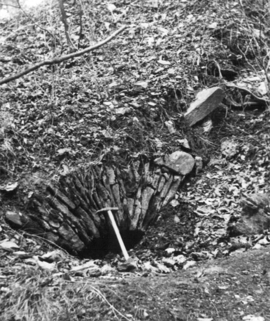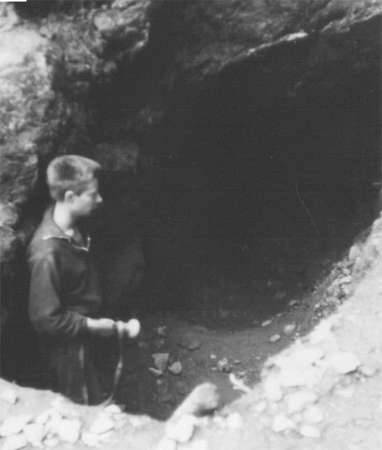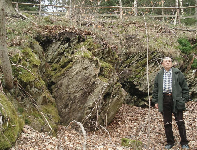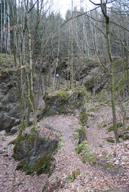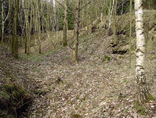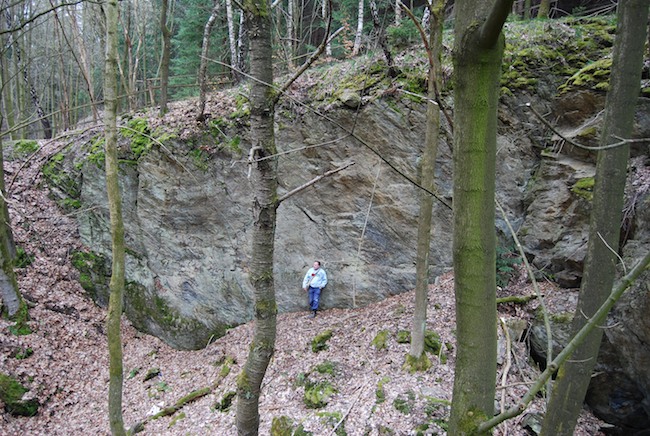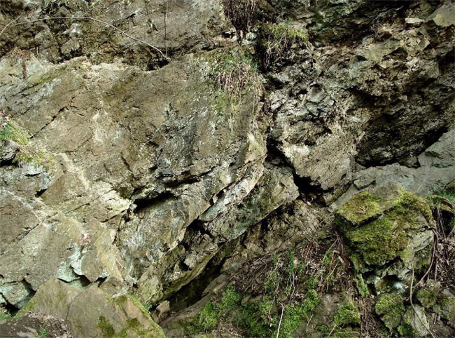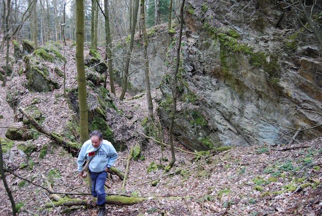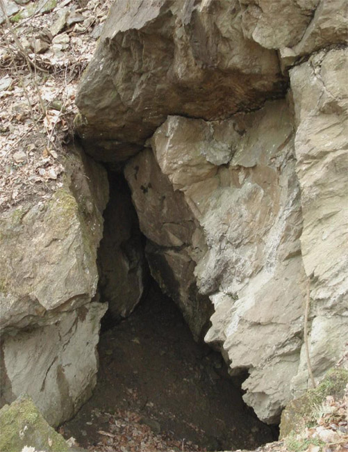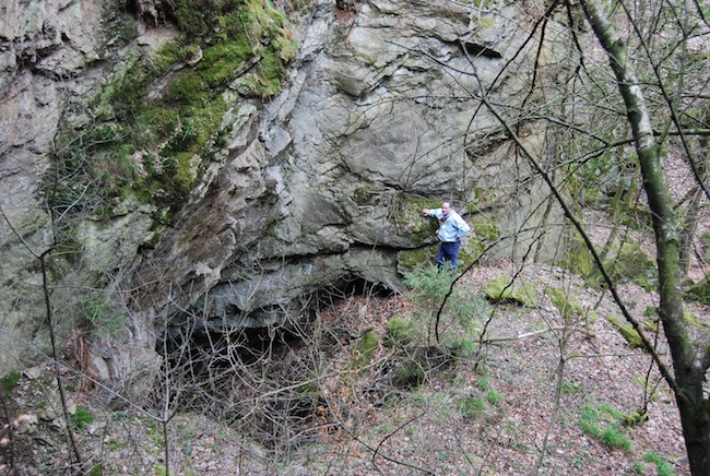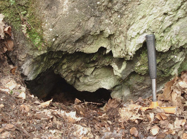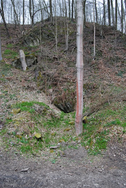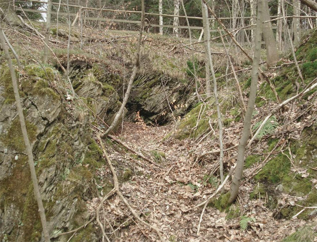 ![]() Ein weiteres Stollnmundloch liegt rechts der vormaligen Walkmühle hinter dem Bahndamm an einem markanten Felsvorsprung der Kalkschieferzone. Bei beiden Objekten handelt es sich um Erkundungsbaue zur Ausrichtung der Kalkgewinnung. Foto: L. Mitka