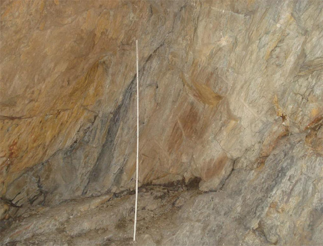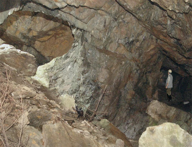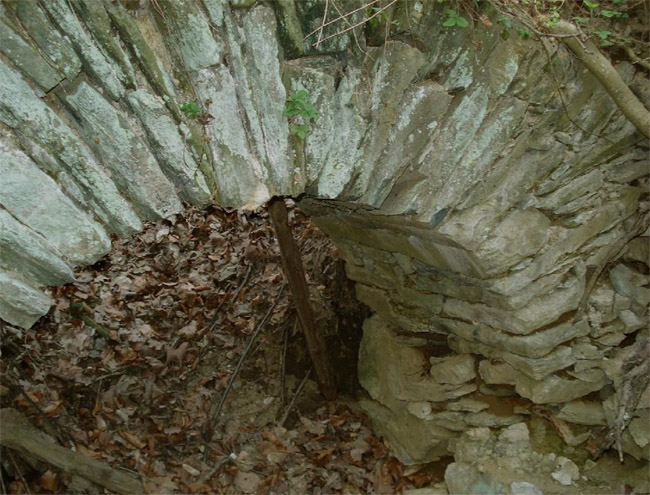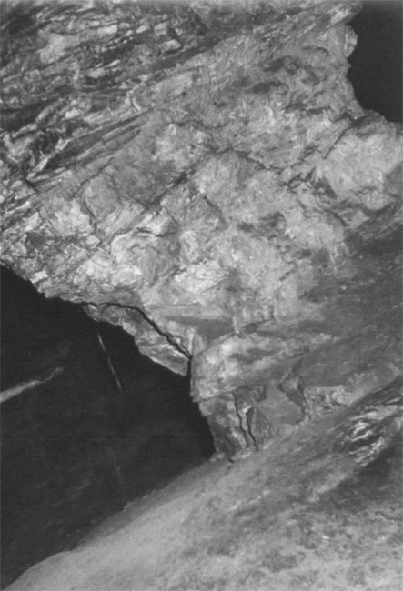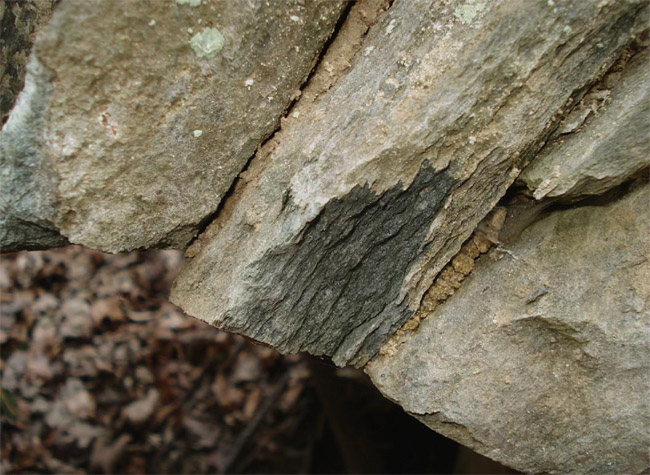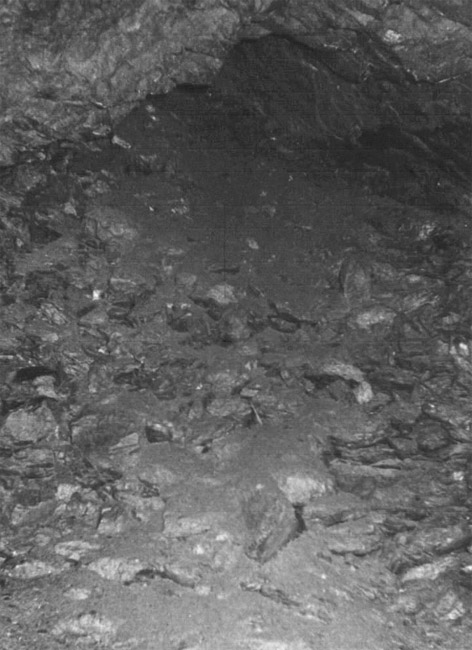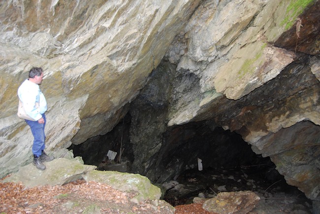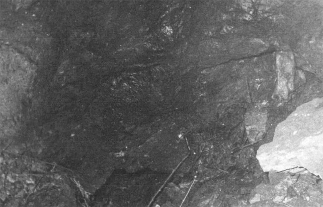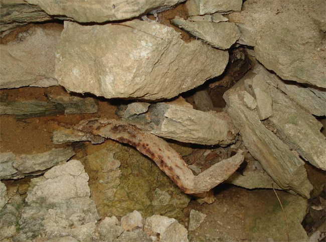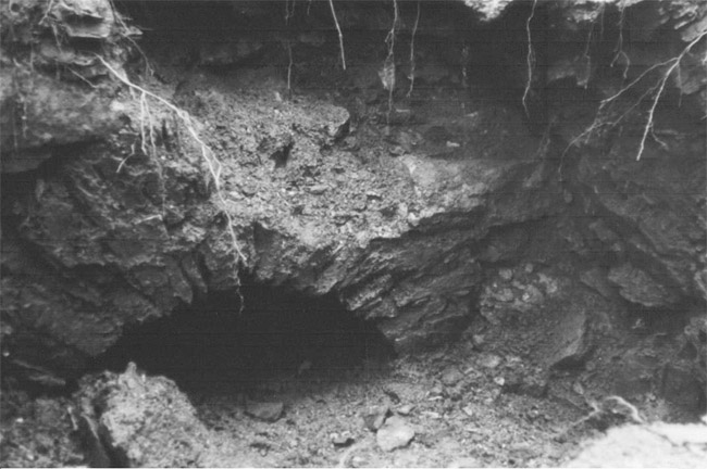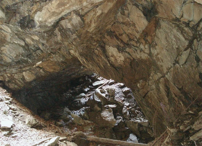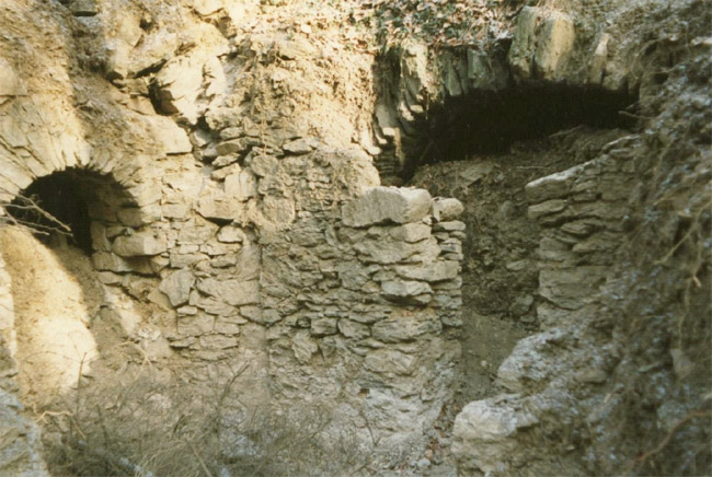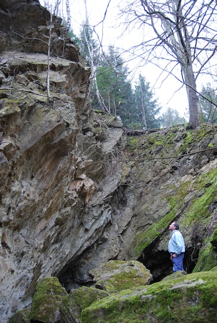 ![]() Ein weiteres Stollnmundloch liegt rechts der vormaligen Walkmühle hinter dem Bahndamm an einem markanten Felsvorsprung der Kalkschieferzone. Bei beiden Objekten handelt es sich um Erkundungsbaue zur Ausrichtung der Kalkgewinnung. Foto: L. Mitka