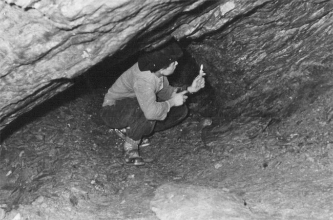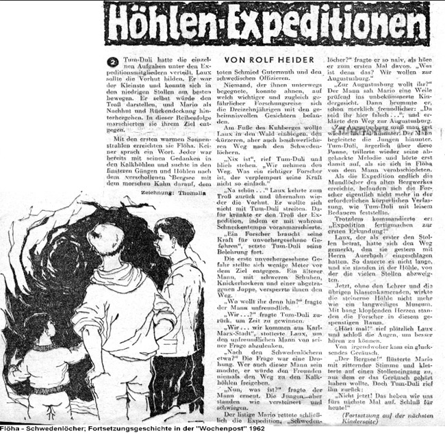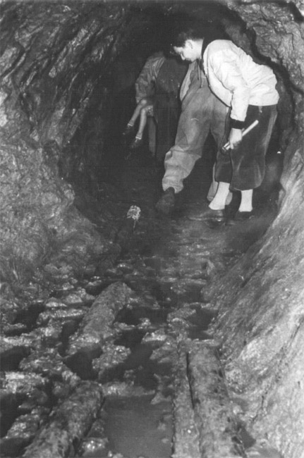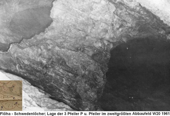 Das nachfolgende Bildmaterial stammt ausschließlich aus der Tätigkeit der Arbeitsgemeinschaft Geologie der Station „Junge Techniker und Naturforscher“ Augustusburg, Sektion „Forschungsgruppe für die Schwedenlöcher“, kurz „AG Schwedenlöcher“ genannt. Die Fotografien fertigte Jost Lehnhardt, ein Lehrer aus Flöha an und entwickelte diese auch selber. Verwendung fand ein großes elektrisches Blitzgerät mit separaten Bleiakku. Das originale Bildmaterial befindet sich heute in der Sammlung von Helmut Kroh. Die Erschließung der sogenannten Schwedenlöcher hatte die Schaffung eines Besucherbergwerkes als Ziel und sah die gesicherte Erhaltung dieses Kulturdenkmals vor. Anfänglich erfolgte eine Bestandsaufnahme und Freilegung der damals bekannten Zugänge. Diese Arbeiten endeten mit der Kartierung des untertägigen Objektes und der Erstellung eines Grubenrisses nach bestem Wissen und Gewissen mit den damals einer AG zur Verfügung stehenden Hilfsmittel. Der originale Grubenriß ist noch heute erhalten und wird von Helmut Kroh verwahrt. |