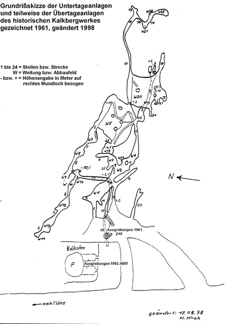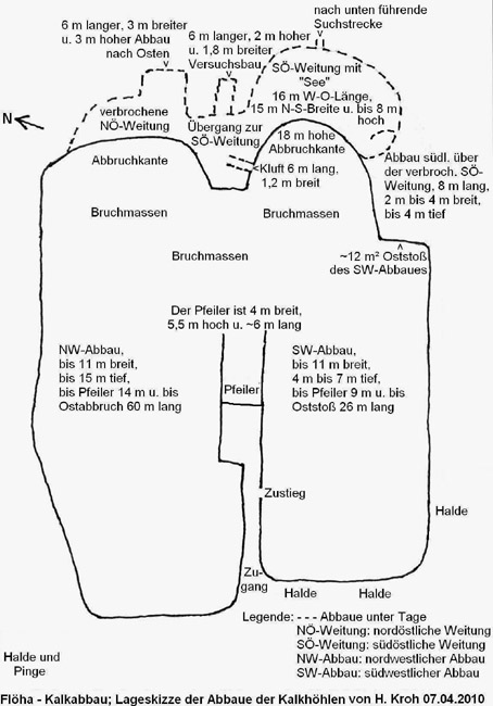 Die so genannten Kalkhöhlen wurden wahrscheinlich als Tage- und Tiefbau begonnen. Darauf könnten die Pinge am westlichen sowie Halden am westlichen und südlichen Rand des Kalkbruches hindeuten. Am nördlichen und östlichen Bruchrand befinden sich keine Halden. Der Tiefbau erfolgte wohl über einen Stolln, der unterhalb der Kalkhöhlen lag und seinen Anfang in einer der Pingen nahm. Nach den 2006 noch sichtbaren, nahezu horizontal oder von oben nach unten handgebohrten Bohrlochpfeifen zu urteilen, erfolgte der Abbau von West nach Ost. Am ca. 12 m² großen Stoß eines nach Osten vorgetriebenen Abbaues sind Reste von 12 Bohrlöchern vorhanden, die alle senkrecht zum hier ca. 45° einfallenden Kalkschiefer gebohrt sind. In der großen südlichen Weitung unterhalb einer kurzen, nach Osten vorgetriebenen Strecke ist eine Reihe von zehn horizontal gebohrten 30-mm-Sprenglöchern zu sehen. An anderen Stößen der Abbaue sind ebenfalls Reste von Bohrlöchern vorhanden. Das bedeutet, dass Vortrieb und Abbau mittels Schießen erfolgten und dieser Teil des Bergwerks demzufolge nicht vor dem 18. Jahrhundert in Umgang kam. In der Mitte des Bruches sehen wir einen heute frei stehenden 5,5 m hohen Pfeiler, an dessen Westseite die Faltung des Kalkschiefers durch tektonische Vorgänge sowie an drei Seiten Bohrlochreste sehr gut erkennbar sind. Dieser 4 m breite und ca. 6 m lange „Mittelpfeiler“ oder besser Bergfeste könnte eine insgesamt 26 m breite Weitung getragen haben, die sich 11 m nach Norden und 11 m nach Süden erstreckte. Bei einer wahrscheinlichen Höhe bis 8 m wäre diese Weitung im nördlichen Teil von Westen bis zum Pfeiler 14 m und bis zur nächsten Mittelauflage ca. 34 m lang gewesen. Möglich wäre auch, dass nur eine nördliche Weitung bestand, die völlig zu Bruch ging und deren Nordwand von der mit Bruchmassen gefüllten Sohle bis zur Erdoberfläche 2006 noch 15 m hoch war. Der südliche Abbau ist 2006 bei 11 m Breite und 4 m bis 7 m Tiefe vom Weststoß bis zum Pfeiler ca. 9 m und bis zum ersten Oststoß 26 m lang. Der schwere Verbruch der Kalkhöhlen lässt eben auch den Schluss des untertägigen Abbaus zu. Zumal das Deckgebirge sehr schwach und der Kalkschiefer durch Witterungseinflüsse eh stark beansprucht ist. Die 2006 noch existierende große, teilweise verbrochene südliche Weitung am Ostende des Abbaufeldes ist bis 8 m hoch, hat eine West-Ost-Länge von 16 m, eine Nord-Süd-Breite von ca. 15 m bei nicht abgegrenztem Übergang zur nördlich angrenzenden, verbrochenen Weitung und ist ohne Pfeiler. Von der Sohle dieser Weitung bis zur Erdoberfläche sind es 18,4 m, die durch den Verbruch der Weitung als teilweise senkrechte Abbruchwand in beeindruckender Weise sichtbar sind. An dieser Wand, über der Abbruchkante der Weitungsfirste südlich der Sickerwasseraustrittstelle für die Eisbildungen, sind 6 Bohrlochreste in Richtung Osten sichtbar. Hier gab es also einen ziemlich hoch liegenden Abbau oder zumindest Abbauversuche. Am Übergang von der südöstlichen zur nordöstlichen Weitung ist 2 m über der Sohle ein 6 m langer, 1,8 m breiter und 2 m hoher, vor Ort endender Versuchsbau nach Osten aufgefahren. In der größtenteils verbrochenen nordöstlichen Weitung ist 2006 noch ein nach Osten geführter, vor Ort endender, 6 m langer, 3 m breiter und 3 m hoher Abbau offen. Das gesamte Abbaufeld der Kalkhöhlen erstreckte sich auf eine West-Ost-Länge von ca. 75 m und eine Nord-Süd-Breite von ca. 30 m. Die Weitungen waren bis 8 m hoch. Die nach Westen hangabwärts gekippte Halde des Tiefbaues hat eine Nord-Süd-Länge von ca. 35 m, eine Ost-West-Breite von ca. 20 m bei einer Höhe bis 12 m. Sie geht terrassenförmig in die Halde des großen Tagebaues über, die scheinbar teilweise planiert und überkippt wurde. Durch diesen überdimensionalen Weitungsbau, keine oder zu wenige das Hangende tragende Pfeiler, die wechselnde Lagerung, das teilweise bis 75° steile Einfallen des Kalkschiefers sowie dem relativ nahe der Erdoberfläche geführten Abbau stürzte der größte Teil der Grubenbaue erstmalig in den dreißiger Jahren des 20. Jahrhunderts und zum zweiten Mal am 26. Juli 1951 ein. Doch auch danach stürzten und stürzen immer wieder Teile des im Hangenden anstehenden, klüftigen und teils überhängenden Kalkschiefers in die noch offenen Abbaue, so dass sich das Aussehen der Kalkhöhlen ständig verändert. An einigen Stellen ist noch Calcitmarmor zu sehen. In kalten Wintern entstehen bis 5 m hohe Eisgebilde. Von diesem Areal existieren auch ältere Aufnahmen und dokumentieren im Vergleich zu heute den natürlichen Verbruch dieser kleinen Kalkgrube.