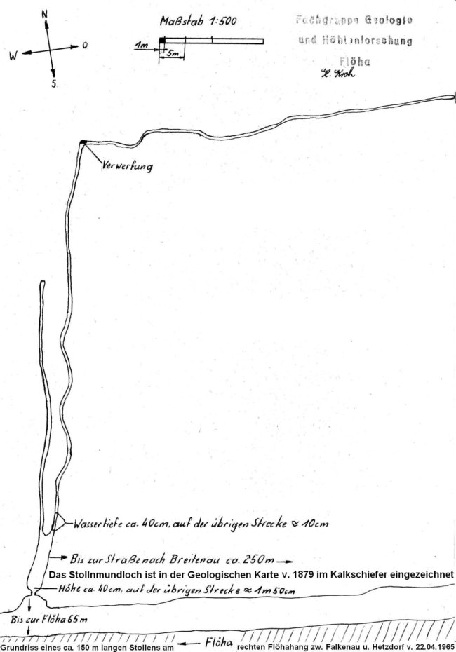 In der geologischen Specialkarte des Königreichs Sachsen, Section Schellenberg-Flöha sind bei Falkenau je ein Stollenmundloch links von der Flöha an der Grenze der Kalkschieferzone zum Phyllit südwestlich der alten Walke unmittelbar vor bzw. unter der Eisenbahnlinie Flöha-Olbernhau (Flöhatalbahn) und rechts von der Flöha direkt im nordöstlichen Ausläufer der Kalkschieferzone eingezeichnet. Der rechts von der Flöha direkt im Kalkschiefer eingezeichnete Stollen ist im April 1965 von Helmut Kroh folgendermaßen beschrieben worden: Das Mundloch des Stollens liegt ca. 250 m links von der Straße nach Breitenau flussabwärts 65 m rechts der Flöha an einem Berghang. Das anstehende Gestein ist Kalkschiefer. Das Mundloch ist teilweise verschüttet, die ersten Meter müssen kriechend zurückgelegt werden. Der Stollen ist 3 m breit und im Durchschnitt 1,50 m hoch. Nach 12,5 m gabelt sich der Stollen. Der linke Stollen verläuft in nordöstliche Richtung, ist 1,0 m breit und endet nach 48 m blind.