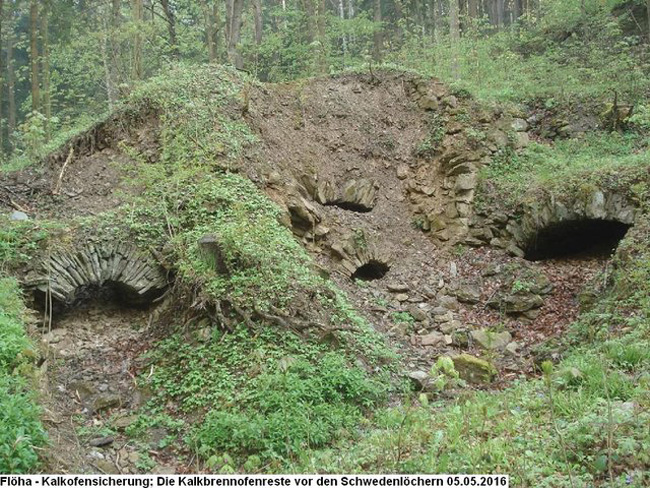 Am 12.04.2000 veröffentlichte die Freie Presse dann aber eine kurze Notiz, daß die untere Denkmalschutzbehörde das Freilegen des Denkmals nicht genehmigt, die bereits frei gelegten Teile zu verfüllen sind und der Zustand vor der „Zerstörung“ durch das ABM- Projekt von 1992/1993 wieder herzustellen ist. Bis 2009 sind danach am Kalkofen keine Arbeiten zur Sanierung oder zur Sicherung mehr ausgeführt worden und die Reste des Bauwerkes verfallen leider immer mehr. Im November 2006 konnte der Kalkbrennofen mit einer Ost-West-Breite von 11 m am Fundament, die Zugänge nach Nord mit einer Breite von 1,0 m und die mit Bruchsteinen gemauerten, nach Norden gerichteten Gewölbe im Innern, mit 3 m bis max. 4 m Breite vermessen werden. Die noch vorhandenen Reste des Kalkofens sind wahrscheinlich nur das Fundament, auf dessen Gewölben der Kalkbrennofen aufgemauert war. Die beiden völlig brandspurfreien Gewölbe und die äußeren Zugänge waren wahrscheinlich der Zugang zum Kalkabzug. Reste von Türangeln beweisen, daß die Zugänge mit einer Tür verschlossen werden konnten. Wie Sichtvergleiche im November 2006 ergaben, könnte der für Teile der Außenmauer des Kalkbrennofens verwendete Quarzporphyr aus dem großen Bruch am Waldweg zwischen Plauberg und der Straße nach Augustusburg stammen. Dafür spricht auch, daß dieser Bruch mit rund 800 m Fahrweg den Schwedenlöchern am nächsten lag und somit der Transport einfach war. Der für die Innen- und Bogenmauerung verwendete Hornblendeschiefer könnte von dem in Platten spaltbaren Hornblendeschiefervorkommen am Weg zur Schweddey 250 m nördlich der Schwedenlöcher stammen. Den vor Ort anstehenden Kalkphyllit verwendete man wegen seiner geringen Festigkeit scheinbar gar nicht oder nur in geringem Umfang zum Bau des Kalkbrennofens. Die Beschreibung des Aufbaus und des Betreibens eines Kalkbrennofens 1812 in Lengefeld finden wir in „Eine Reise durch das Sächsische Erzgebirge anno 1812“ von Hanns Caspar Hirzel, einem Studenten der Bergakademie Freiberg, erschienen 1994 in der Buchreihe „Archäometallurgie & Montangeschichte“.