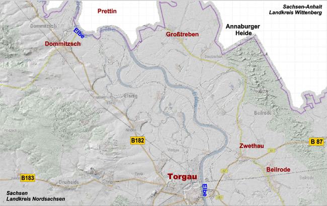 Östlich reichen die Moränen- und Sanderhügel der Annaburger Heide bereits in den Landkreis Elbe-Elster des Landes Brandenburg hinein. Unmittelbar nördlich des Ortes beginnt der Landkreis Wittenberg des Landes Sachsen-Anhalt. Eine Gierfähre erlaubt die Elbquerung von Dommitzsch nach Prettin, die nächste Brücke quert die Elbe in Torgau.