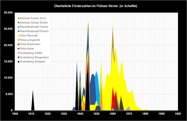 d.) Förderung: Der Umstand, daß Eigentümer des Pfarrwaldes eine Behörde war, deren Akten über Abbau und dafür abgelieferten Zehnten erhalten sind, ermöglichte es, ebenso wie später beim Bergbau im fiskalischen Struthwald, die Förderung fast bis auf den Scheffel genau zu erfassen. Die folgenden Produktionsziffern bis 1855 sind nach den Akten des Justizamtes Augustusburg No. 46 und der Flöhaer Ephoralakten berechnet. Für die Förderung von 1855 bis 1881 waren die genauen Zahlen für jedes Jahr im Anhang über das Pfarrkohlenkapital bei der Pfarrholzkasse zu finden. Letztere Zahlen stimmen nicht immer mit