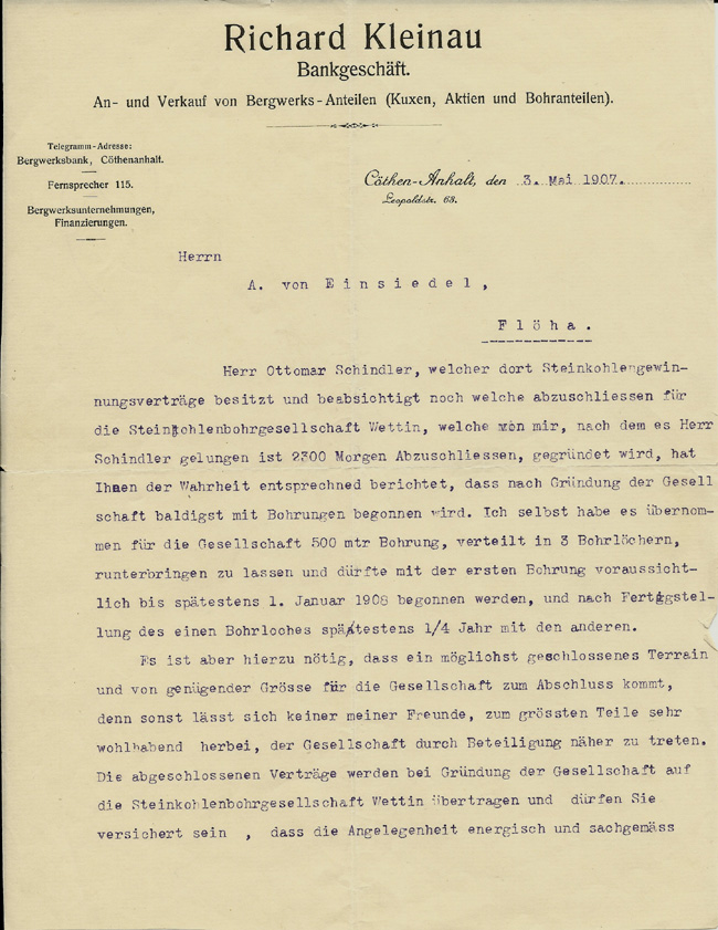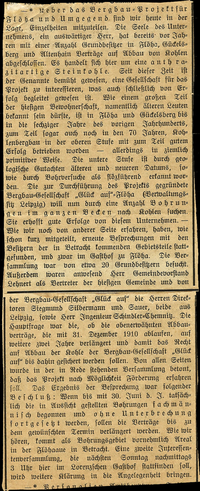 Auch des Flöhaer Beckens bemächtigte sich der Spekulationsgeist. Ein Ingenieur, Ottomar Schindler aus Chemnitz, der selbst Grundbesitz in der Aue bei Flöha besaß, entfaltete 1907 eine rührige Tätigkeit, gewisse Kreise für das Flöhaer Becken zu interessieren. Er schloß mit verschiedenen Grundeigentümern Verträge über das Abbaurecht des Unterirdischen ihres Besitzes ab, und es gelang ihm, die Gründung einer Bergbaugesellschaft „Glück Auf Flöha“ in die Wege zu leiten. Im Gesellschaftervertrag vom 19. Juni 1908 brachte Schindler seine Verträge mit Flöhaer Grundbesitzern in die Gesellschaft ein, er selbst wurde neben einem Hernn Siegmund Silberstein, einem Direktor A. Sauer, Leipzig, und einem angeblichen Rittergutsbesitzer Kurt Schneider, Zeisau, in den Vorstand der Gesellschaft aufgenommen.