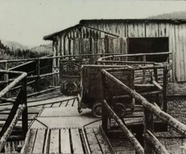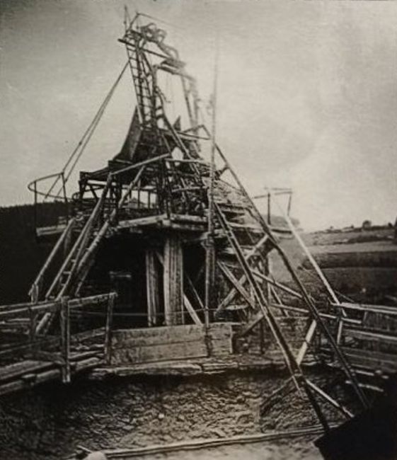 ![]() Anfang 2026 gab es eine Ausstellung zur Geschichte des Kalkwerkes in Thum, bei der diese Bilddokumente abzufotografieren waren. Bei den Fotos in den Vitrinen war leider die Entstehungszeit nicht vermerkt, doch vermuten wir, daß sie wohl noch aus der Zeit um 1945 stammen. Hier ein Blick auf den Förderschacht...