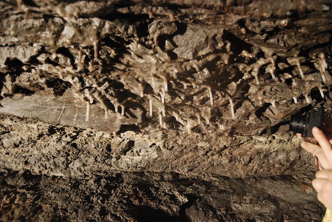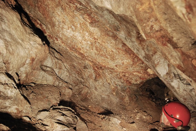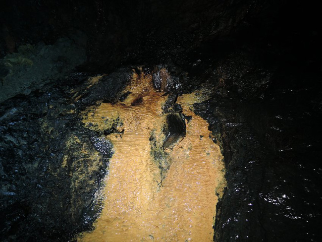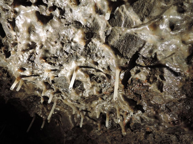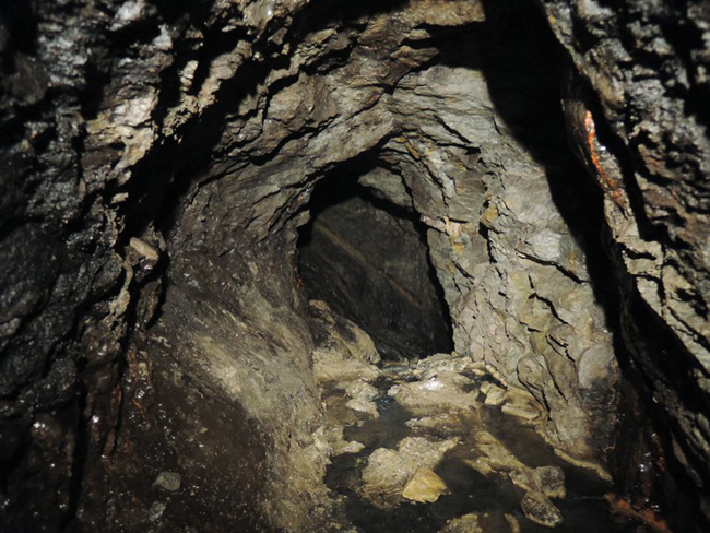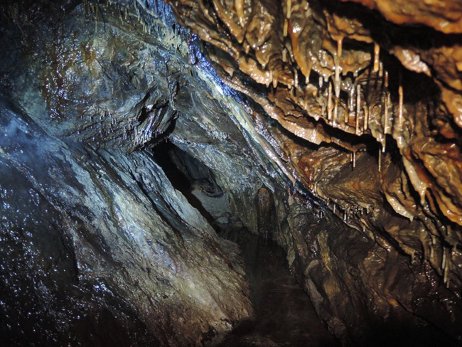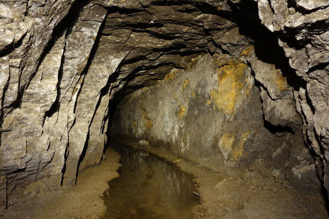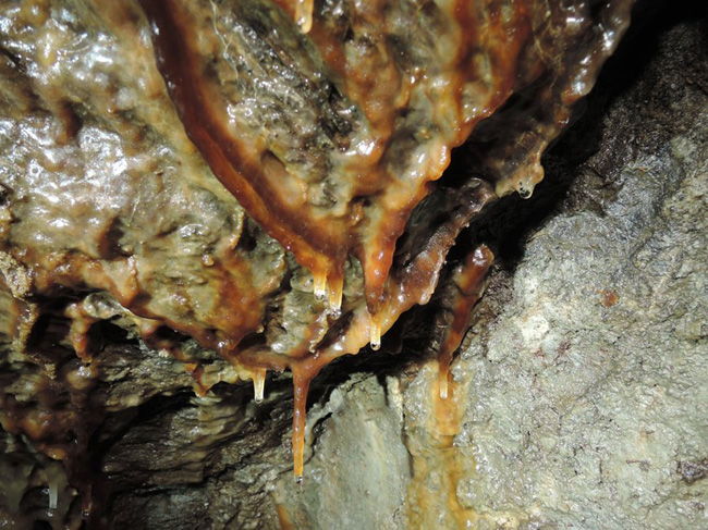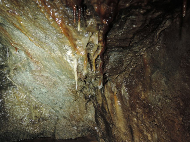 ![]() Sinterbildungen könnten auf Erzführung im Gestein hinweisen. Foto: D. Oehme