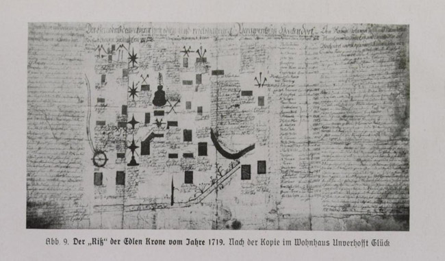 Tatsächlich stieß man 1854 im Felde von „Unverhofft Glück“ in alten Bauen auf Spuren eines ehemaligen Hochwassers, das die Bergleute seinerzeit gezwungen haben wird, die Baue zu verlassen, ohne die dort anstehenden, sehr reichen Erzmittel völlig abbauen zu können. Der wahre Kern der Sage dürfte damit entdeckt worden sein. Es scheint auch hierzu zu passen, daß Joseph Benno Theler am 8. Juni 1565 Höckendorf mit dem „Bergwergk mit den Erbkrssen (gemeint sind wohl Erbkreise – Anm. d. Red.) nach Erzgebirgischen Brauch, wie ich dessen berechtigt gewesen, zusampt aller Buchwergen und Hüttenstadtelen“ für 25.000 Gulden meißnischer Währung an den Kurfürsten Vater August verkaufte (HSA Loc.37277 Rep.XXII Dipp.6 und OU Geh. Fin.-A. Rep. K 997). Die erste schriftliche Niederlegung einzelner Bestandteile der Sage findet sich in den phantastischen Wahlenberichten (Horns Nützliche Sammlungen, 1728). Um 1719 taucht dann ein merkwürdiger Riß auf, also ein Bergwerksplan, der weiter unten beschrieben werden wird. Im 19. Jahrhundert wird die Sage mehrfach abgedruckt. Literarisch am bedeutendsten ist eine Novelle von Alexander Bronikowski, dessen polnische, geschichtliche Romane vor 100 Jahren (also um 1830 – Anm. d. Red.) gern gelesen wurden. In der „Grube zu Höckendorf“ gibt er, ziemlich unbelastet mit geschichtlichem Wissen, eine Schilderung vom Leben der Theler und vom Untergang der Grube und fügt dabei nach meiner Ansicht der zu seiner Zeit schon ausgestorbenen Familie schweres Unrecht zu. Vor allem scheint er sich in der Schilderung der Mechthild Theler als keifende, geizige Witwe von dem ungünstigen Eindruck auf ihrem Grabstein haben leiten lassen.“