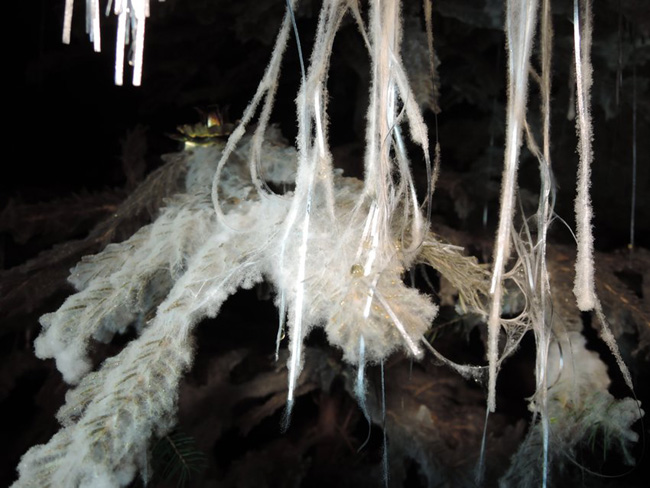 ![]() Ein Überbleibsel von Mettenschichten aus der Neuzeit. Weihnachtsbaum mit von selbst gewachsenem „Naturlametta“.