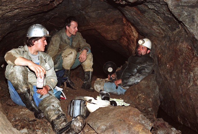 ![]() Pause. Die Befahrergruppe um die Dokumentaristen Gerd Voigt und Jörg Piller sowie weiteren Unterstützern in den frühen 1990er Jahren auf dem St. Georgen Stehenden in der Edlen Krone. Foto: J. Piller, Sammlung G. Voigt