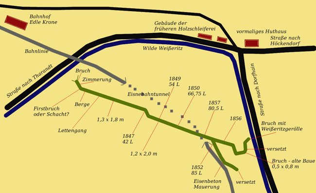 Tagesbrüche und Schäden durch den Bergbau traten schon recht frühzeitig auf und hatten natürlich ihre Ursache im Bergbaubetrieb der früheren Jahrhunderte. So durch die tagesnahe Gewinnung in Strossenbauen und dicht an die Tagesoberfläche heran reichenden Firstenbauen, sowie in unzureichender Verwahrung von Schachtanlagen. Eine regelrechte „Verwahrungswelle“ von Grubenbauen entstand aufgrund von Umbauarbeiten am Eisenbahntunnel und der Bahntrasse der heutigen Sachsenmagistrale 1961. Vorausgegangen war eine Befahrung und Dokumentation sämtlicher noch zugänglicher Grubenbaue durch die Bergsicherung Dresden um 1970. Als Grundlage diente meistens die Dokumentation der Befahrergruppe um Herrn Pertermann. Doch waren zu dieser Zeit schon einige Stolln durch nachträglich eingebrachten Verbau auf Kosten der DR gesichert oder auch mittels Plomben verwahrt worden. Wir können aber jetzt schon sagen, daß die Unterlagen dieser Befahrergruppe nicht der Anlaß für Verwahrungsarbeiten waren, sondern vielmehr der Umbau des Tunnels und Gleisverlauf sowie aufgetretene Bergschäden im Gelände der DR bei Edle Krone.